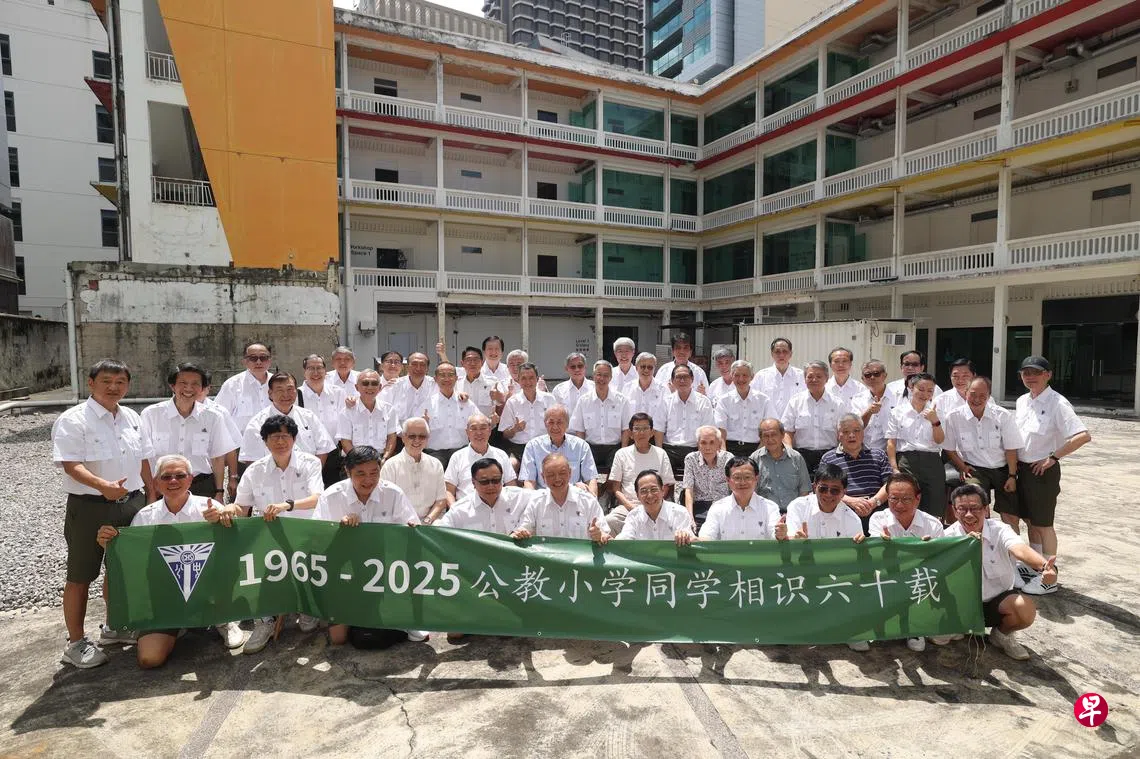 “公教中学,屹立星洲……”为庆祝相识60周年,公教中学(附小)的50多名校友再度相聚。身穿当年的校服,他们齐声唱起校歌,熟悉的旋律在空气中回荡,仿佛打开了一本尘封已久的相册,往昔的画面瞬间跃然眼前。