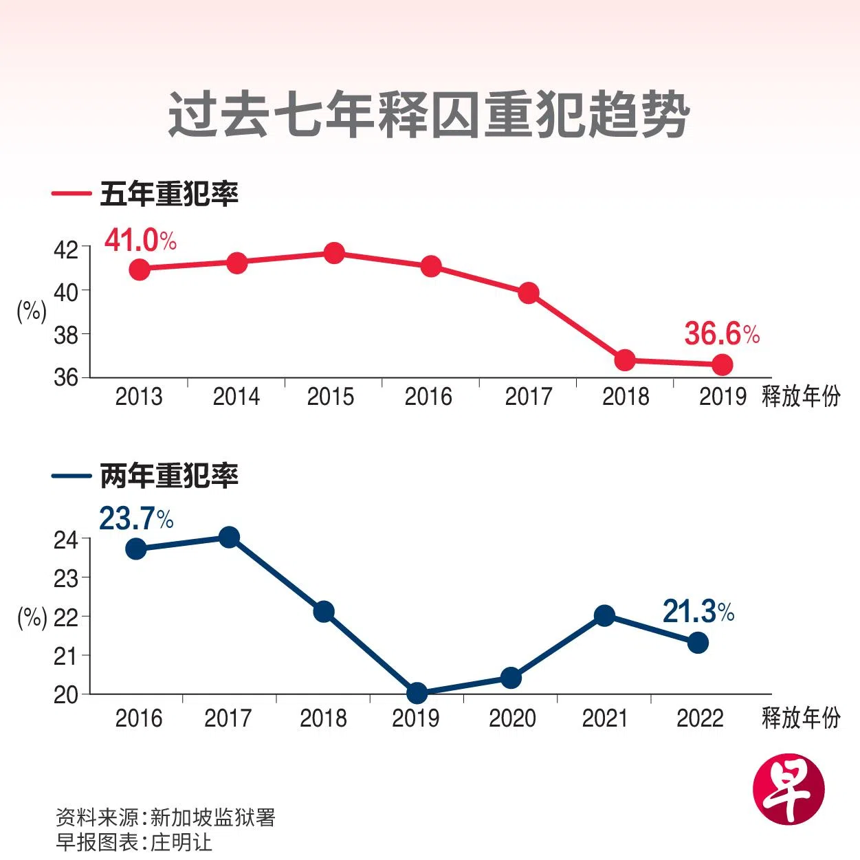 至于释囚的两年重犯率,在经历连续两年增加后,2022年减至21.3%,比上一年的22%下滑0.7个百分点,在国际上也保持低位。其中,2022年女释囚的两年重犯率减至13%,令人鼓舞。