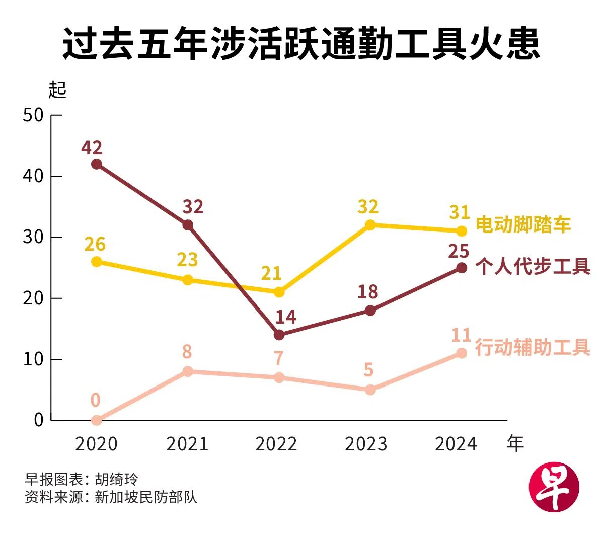 涉及活跃通勤工具的火患连续两年上升,从2023年的55起上升到2024年的67起,增幅逾两成;当中超过一半发生在住宅区内。新加坡民防部队将继续加强宣导,劝请公众切勿隔夜充电,并坚持购买原装电池。