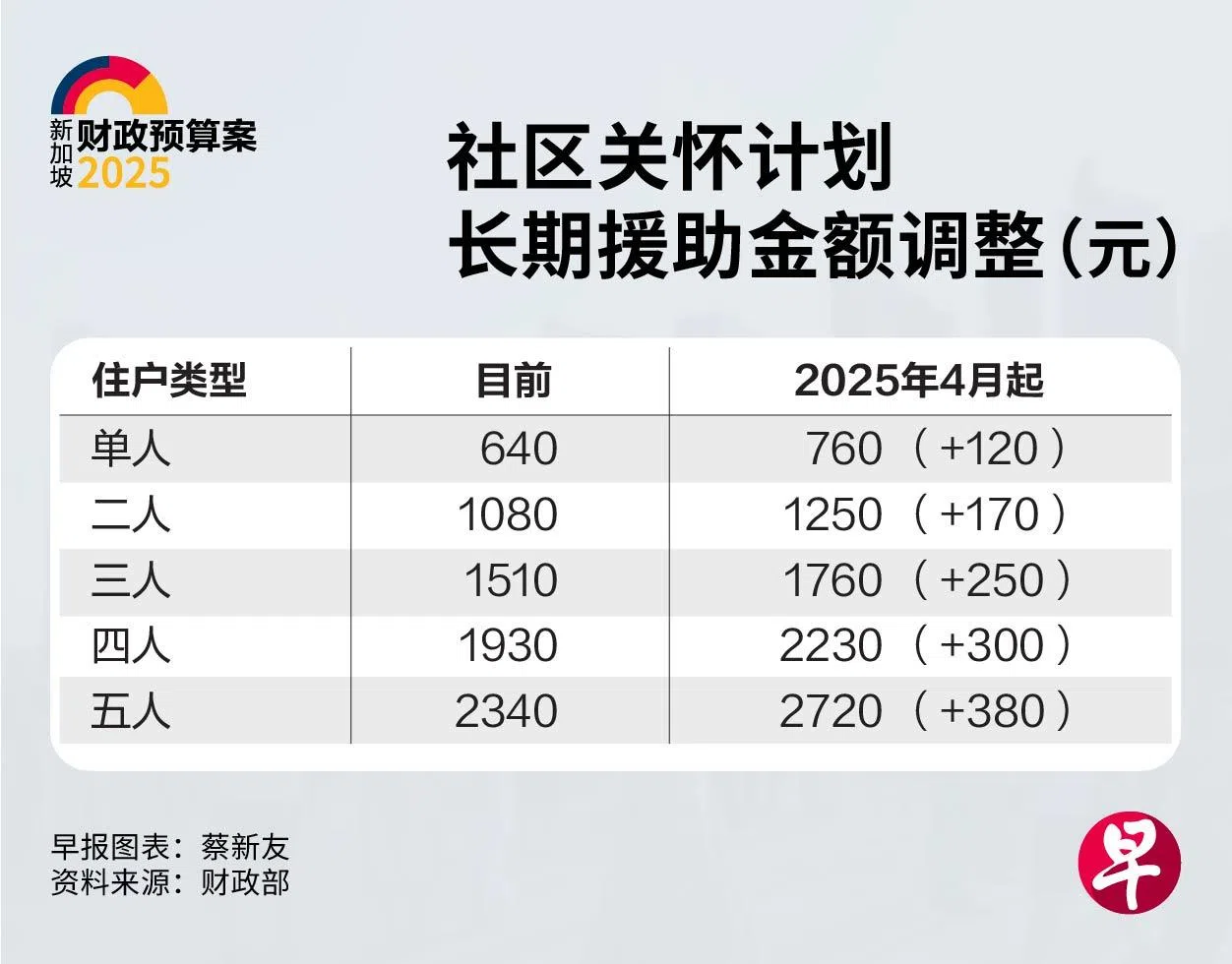 政府也宣布提高社区关怀计划(ComCare)援助的金额,支持低收入家庭应对基本生活开支。其中,接受ComCare长期援助金的单人家庭每月将获得额外120元,调整后的每月现金援助总额达760元。