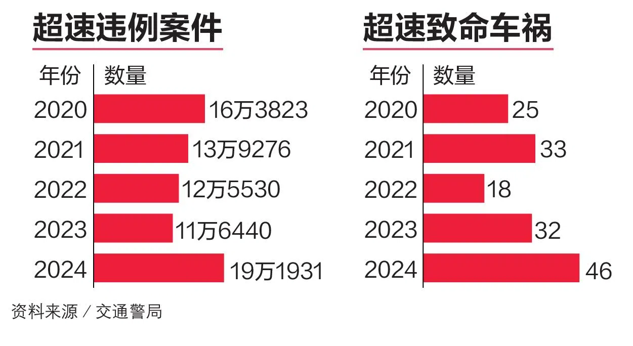 当中,因超速引发的致命车祸从前年的32起增至去年的46起,超速是三分之一致命车祸的原因。因超速而导致的致命事故比率也上升,从2023年的24.4%增加到2024年的33.1%。