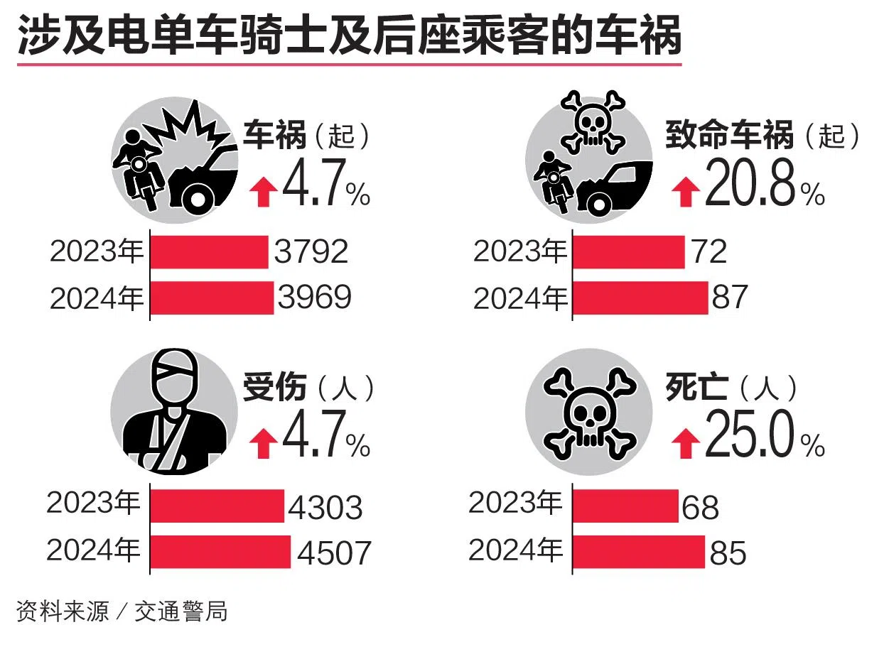 交通警局星期五(2月21日)公布2024年的全年交通数据,其中涉及电单车和年长行人的车祸仍是令人关注的焦点,因为这类车祸的占比仍相对过高。