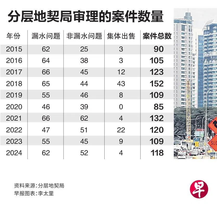 发言人说,“非漏水类别”的纠纷包括侵占共有物业、撤销条例或决议、安装非法结构等,而“集体出售”案件则指根据分层地契法(Land Titles (Strata) Act,简称LTSA)审理的案件,包括附属申请。