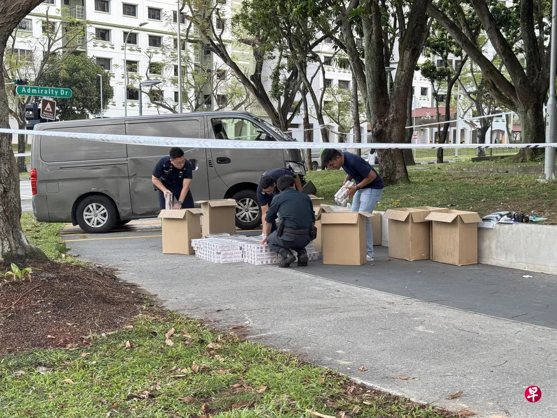 由于事发地点在居民区和交通灯附近,引起不少公众好奇围观。早上7时46分,执法人员将漏税烟搬上新加坡关税局车辆后,载走作为案件证物。