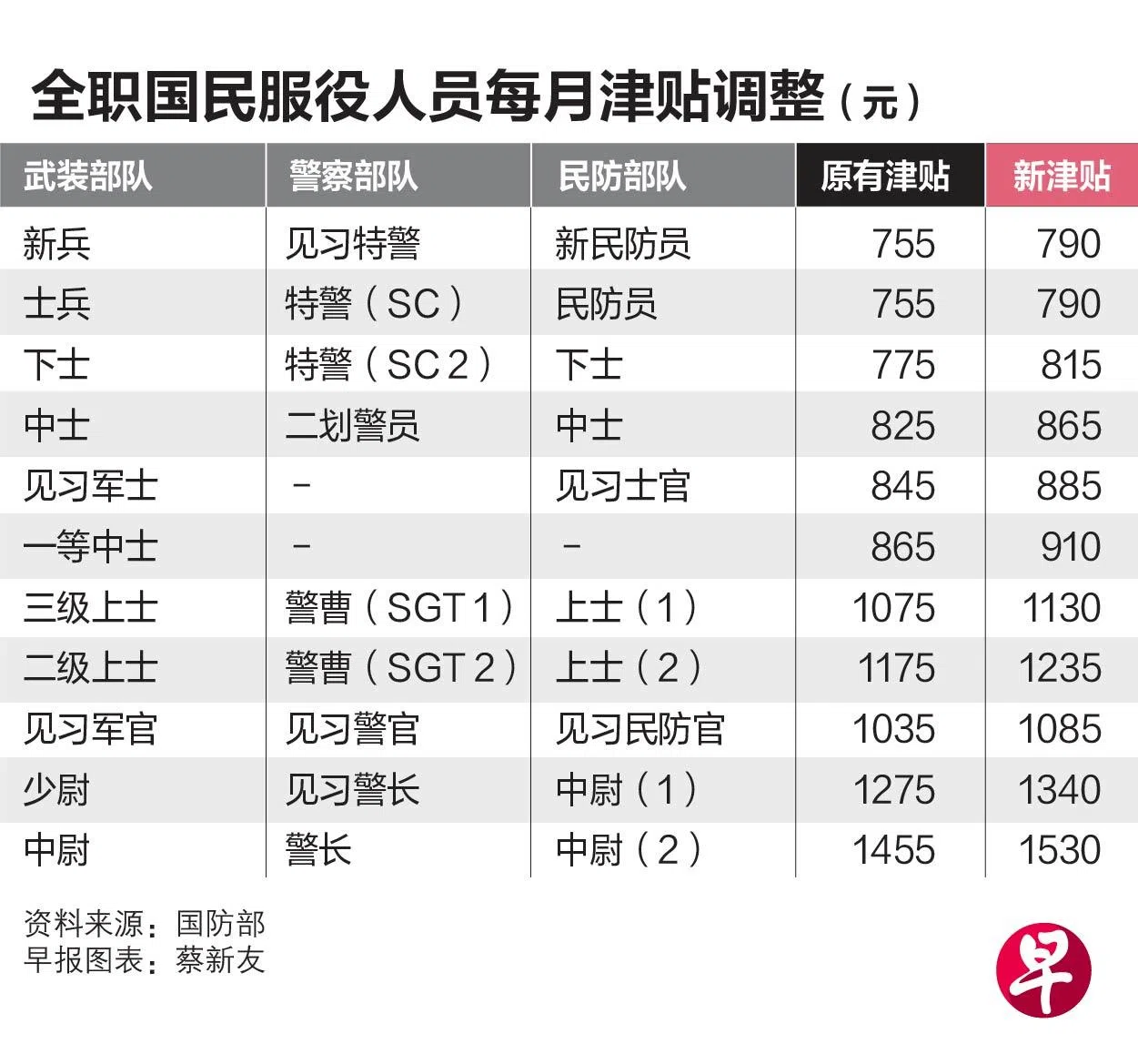 从7月1日起,新加坡武装部队、警察部队和民防部队的全职国民服役人员每月津贴将提高,增幅介于35元至75元不等,整体调整约4%至5%。