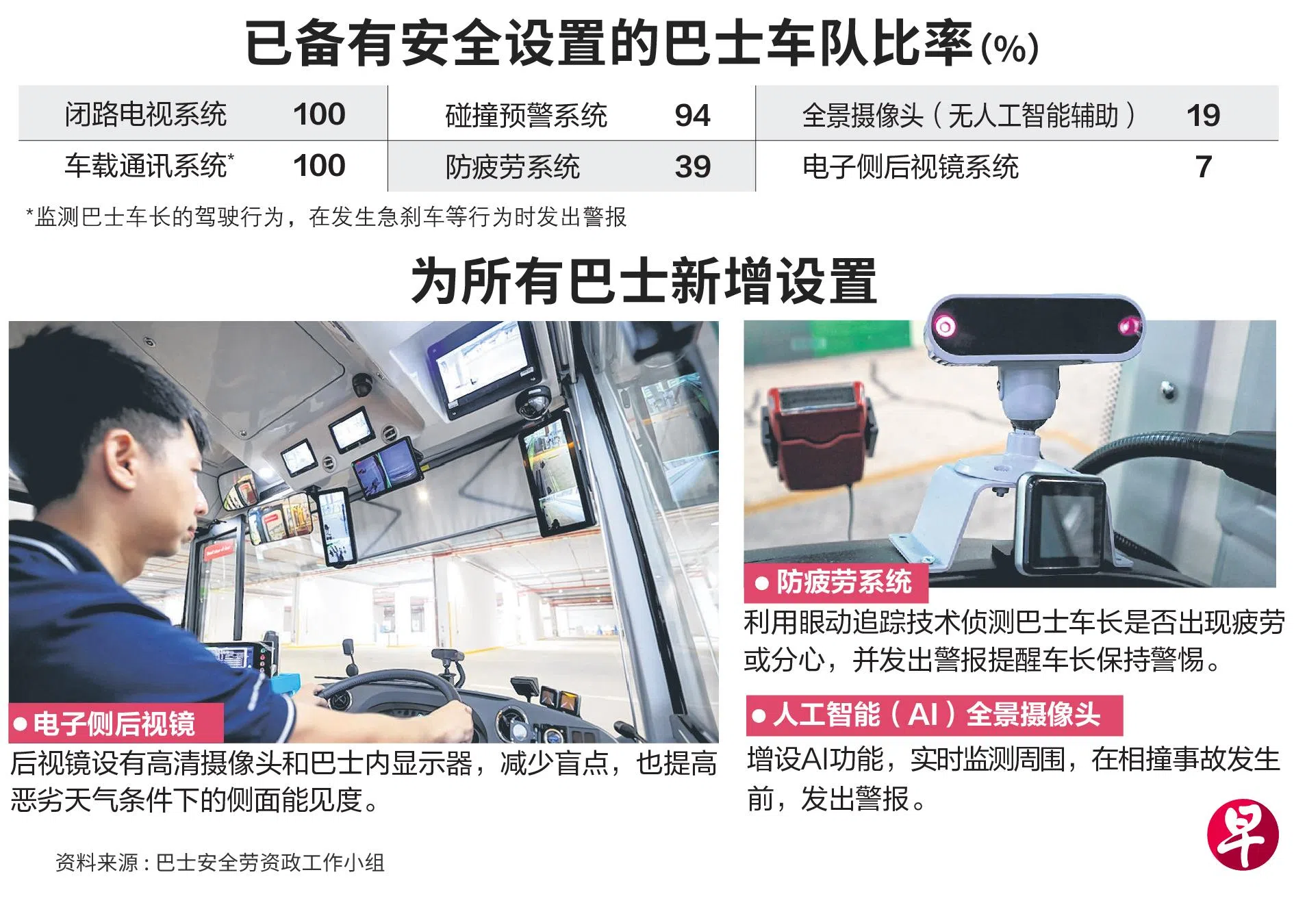 与此同时,陆路交通管理局也将为所有巴士车队安装采用人工智能(AI)的全景摄像头、疲劳监测系统和电子后视镜,借助先进科技提高车长的警觉性,提醒他们注意潜在的安全风险。