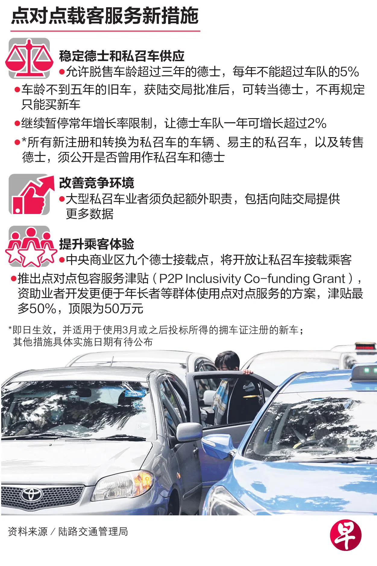 陆交局2023年9月宣布检讨德士和私召车的点对点服务业结构和监管框架,首阶段措施已陆续落实,包括今年起延长德士法定使用年限。