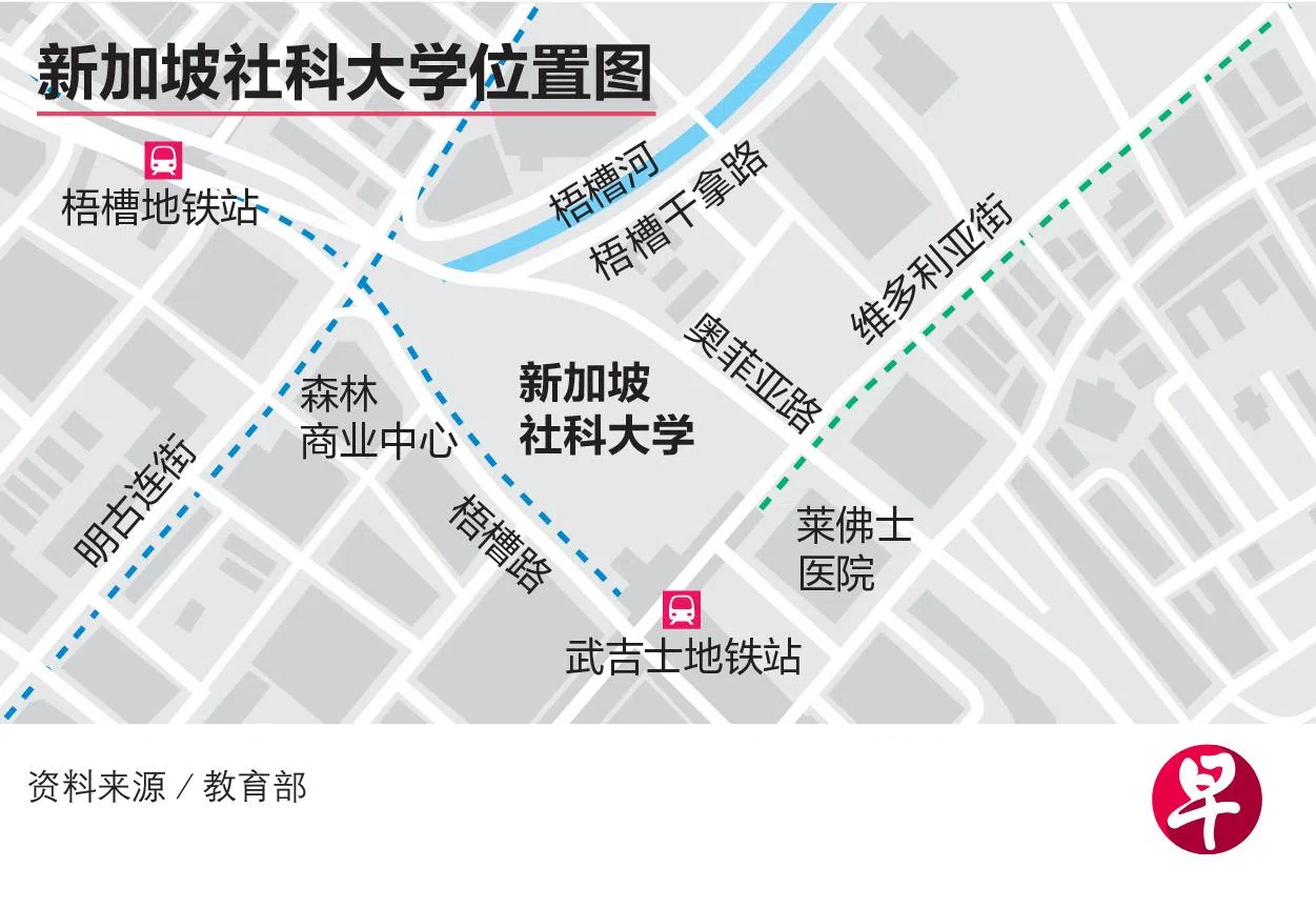 新社科大的市区校园将设在梧槽坊(Rochor Centre)的旧址与周边,预计会在2030年代中期落成。教育部受询时说,这座校园的具体占地面积仍有待确定。