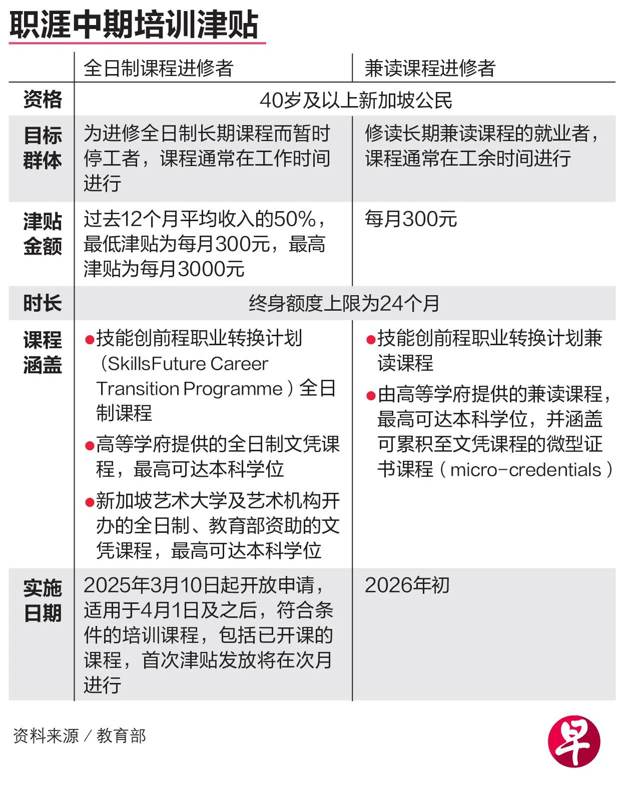 从2026年初起,职涯中期培训津贴也将扩展至选择在工余时间上兼读课程来提升技能的雇员。