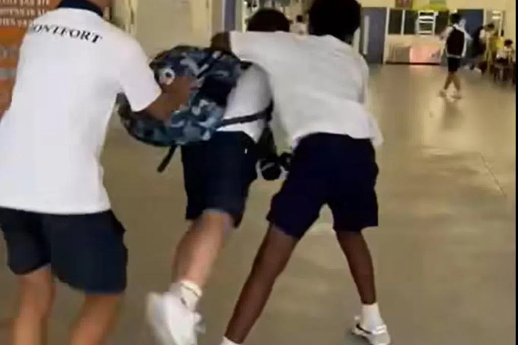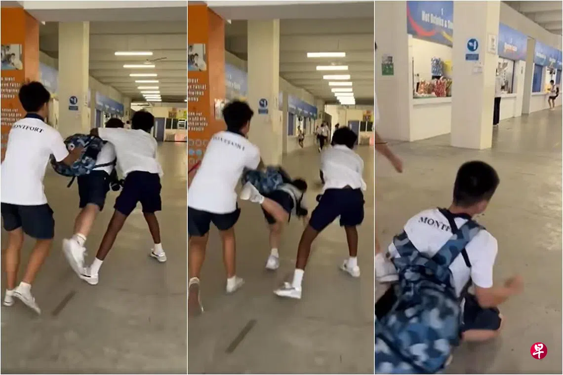 教育部星期一(3月3日)已发声明,还原上个月在蒙福中学发生的事件。视频中遭同学推搡的中一生,稍早前在教室内与两名同学打架,之后被老师发现制止。下课后,两名同学尾随他到楼梯口和食堂,双方又再爆发冲突。涉事的三名中一生将受到适当的处罚,包括打鞭、留校察看和停学。