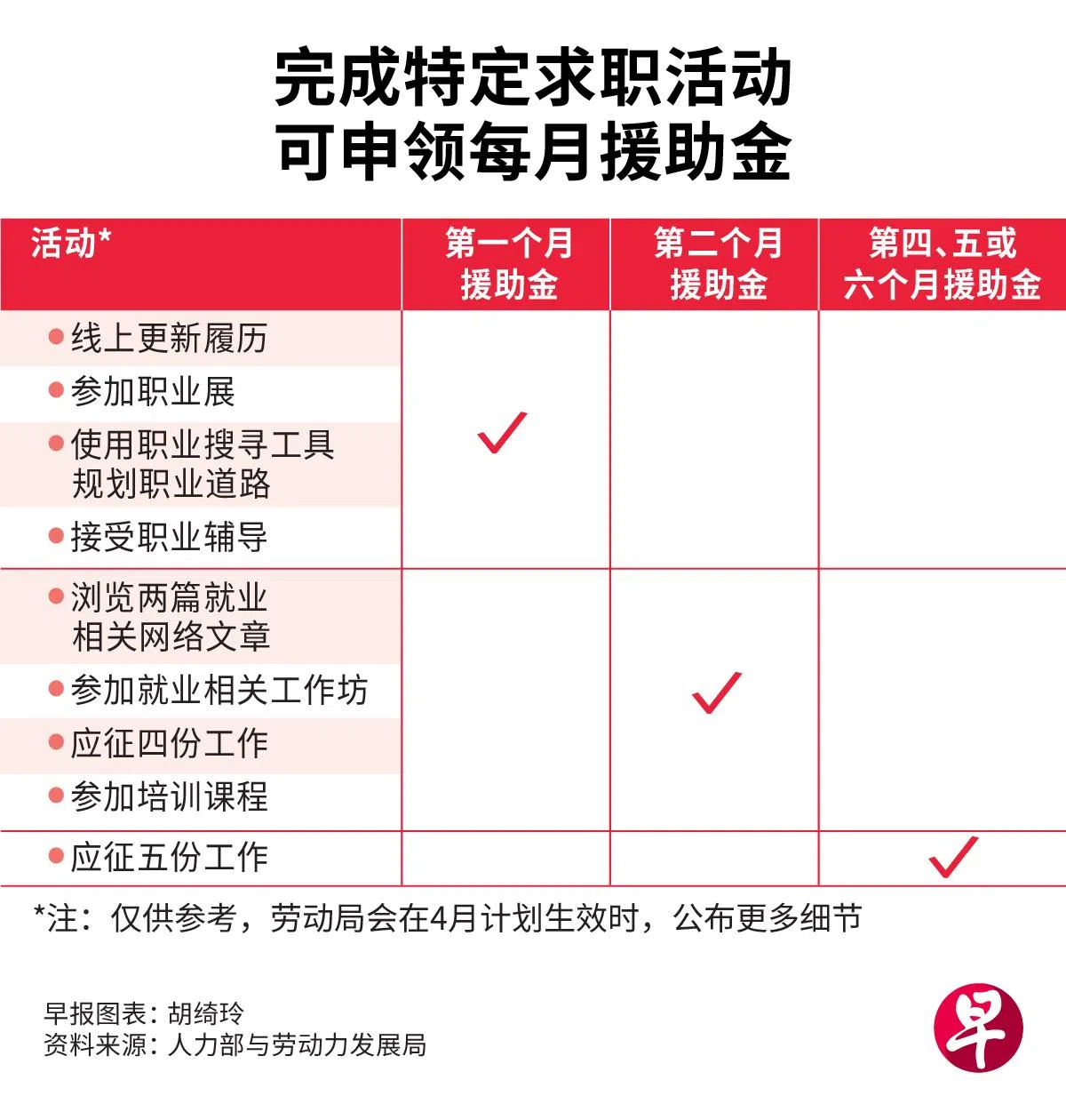 即将在今年4月中旬推出的技能创前程求职援助计划,让非自愿失业者可在半年时间内,申领总额不超过6000元的援助金,但这期间他们须证明确实在积极找新工作,包括参加职业展、上职业辅导课程及应征工作等。