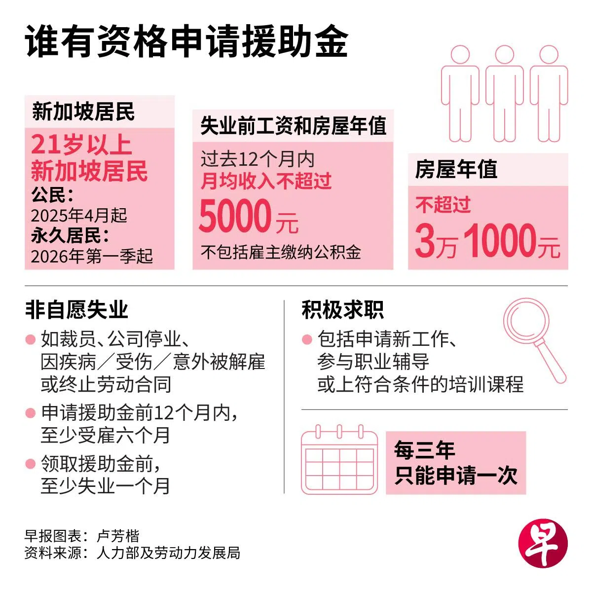 求职援助计划重点关注中低收入阶层的非自愿失业本地居民。他们除了须年满21岁,还必须在申请援助金的前12个月内受雇至少六个月、月均收入不超过5000元(不包括雇主缴交公积金),以及房屋年值不超过3万1000元。