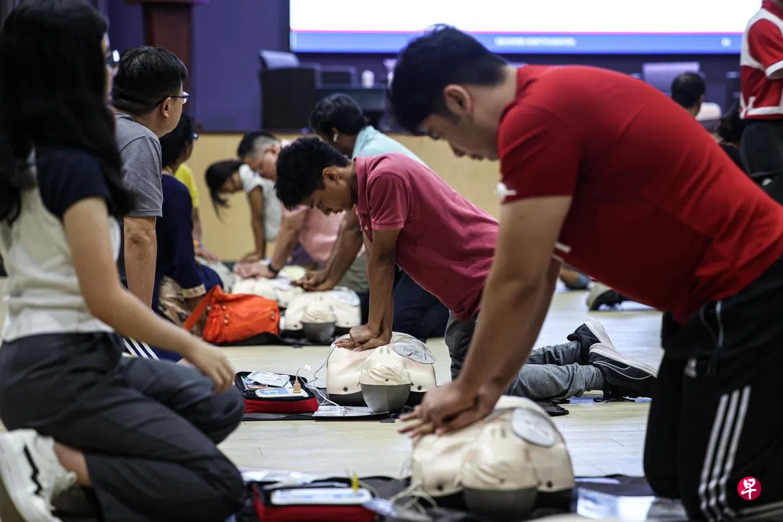 参加培训的居民林树青(69岁,退休人士)说,他在社交媒体上看到活动宣传后,便主动报名。他曾目睹陌生人突发心脏病,这让他深刻意识到,掌握急救技能不仅能在家人和朋友遇到突发状况时派上用场,还能在陌生人遇险时伸出援手。