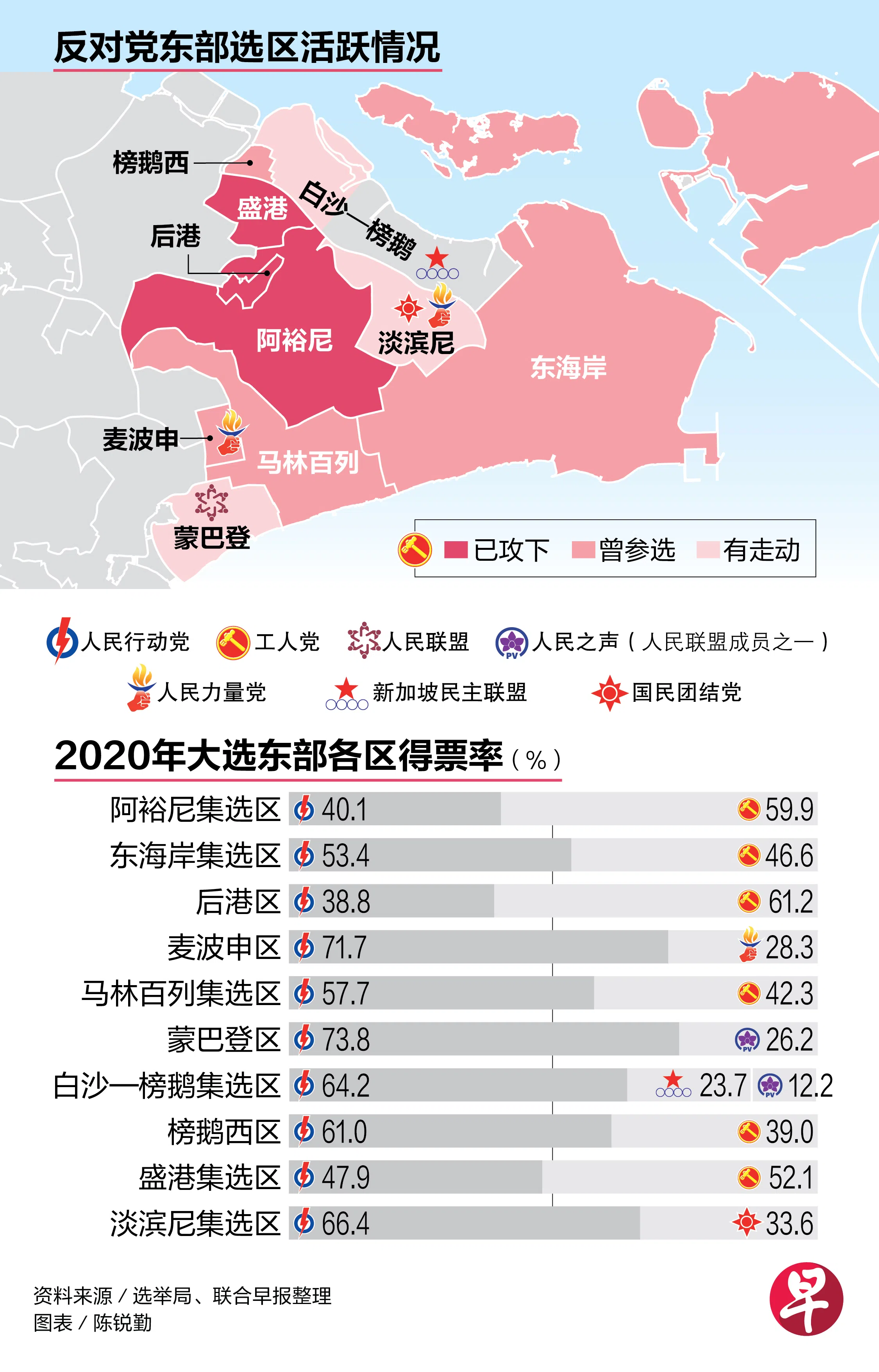 自从工人党1991年夺下后港区议席,又在2011年和2020年赢得阿裕尼集选区和盛港集选区,我国东部每到大选,就是人们最关注的重点战区。人民行动党要如何守住东海岸、马林百列和淡滨尼这三个集选区,以及如何撬动工人党早前拿下的三个选区,是来届大选重要的攻防点。