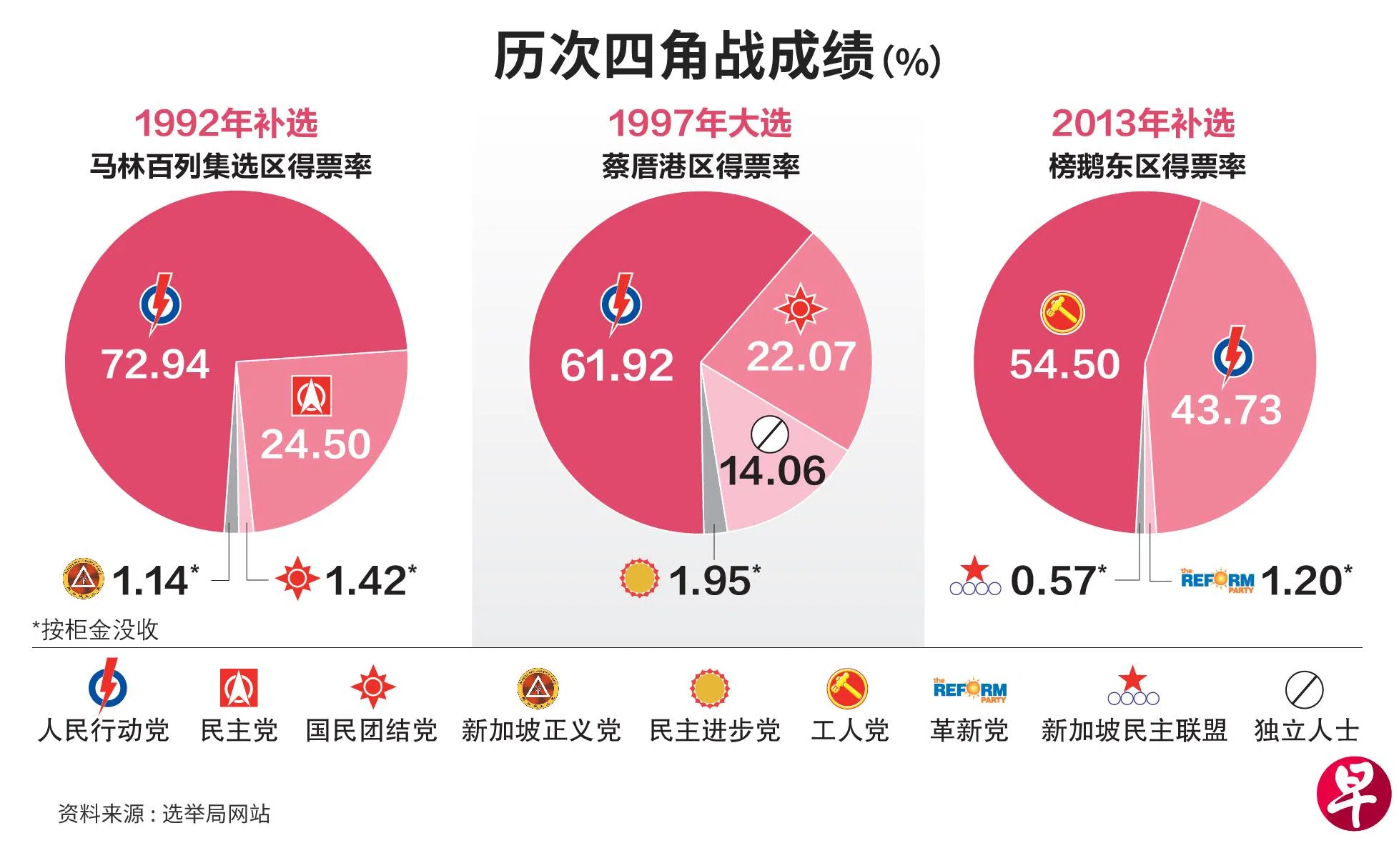 我国自1965年独立以来的大选,只出现过三次四角战,即1992年马林百列集选区补选、1997年蔡厝港区大选,以及2013年榜鹅东区补选。前两次均为行动党获胜,只有2013年由工人党的李丽连胜出。