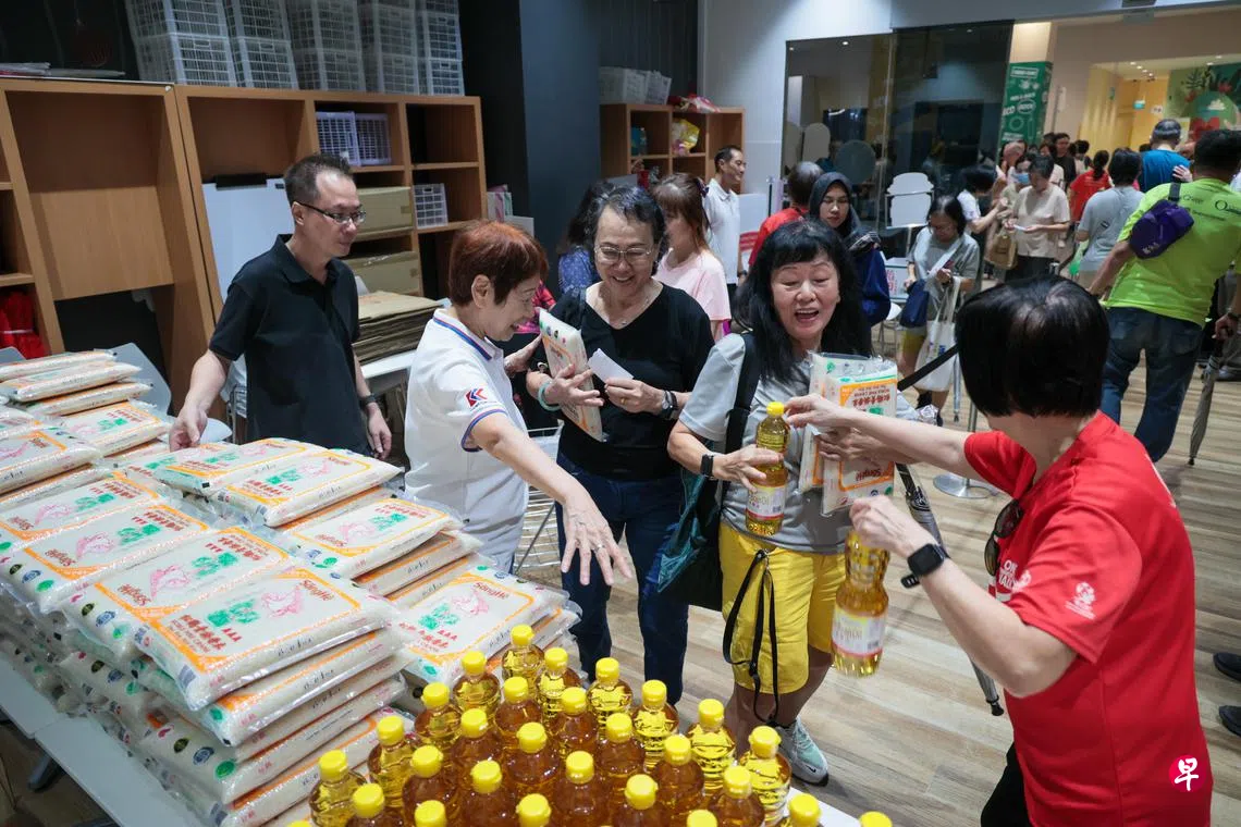 东海岸集选区议员陈杰豪星期天(3月9日)在勿洛心动大厦(Heartbeat@Bedok)的甘榜菜市民众俱乐部,协助工作人员和义工为居民派发杂货物品。