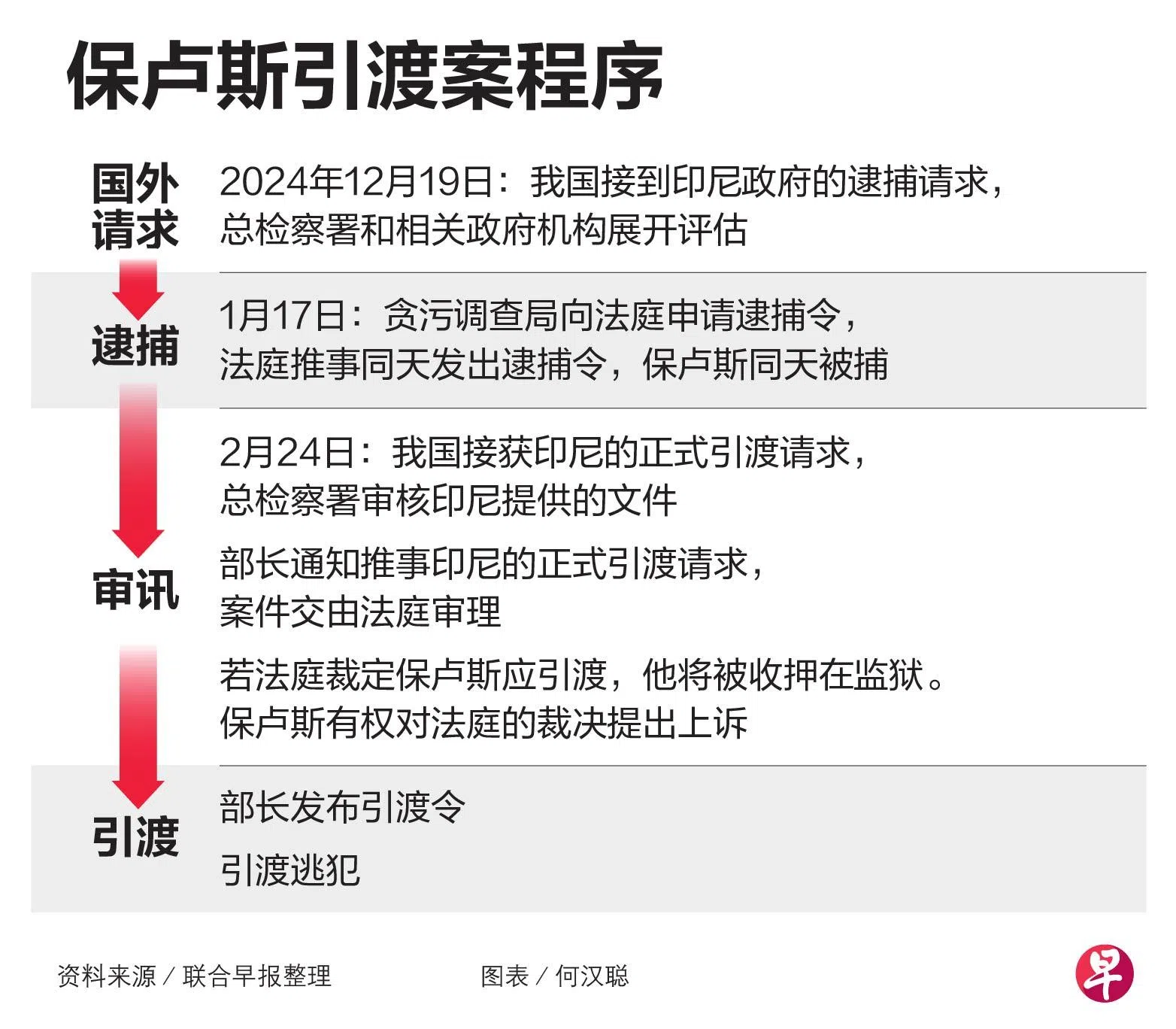 尚穆根解释,在初步的程序后,我国须要印尼提出正式的引渡请求和列明相关证据。我国已在2月24日接获印尼的正式引渡请求。总检察署确定印尼提供的文件符合引渡条件后,案件将交由法庭审理。保卢斯有权对法庭的裁决提出上诉。
