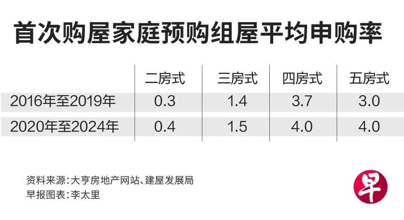 大亨房地产网站(MOGUL.sg)星期二(3月11日) 发布的研究报告显示,首次购屋家庭对五房式预购组屋单位的平均申购率,从2016年至2019年的3.0,跃升至2020年到2024年的4.0;四房式单位的平均申购率,在这期间也从3.7增至4.0。