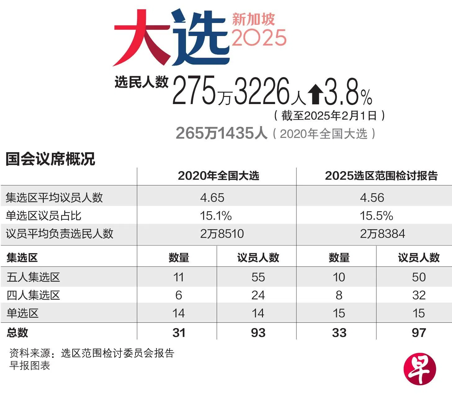 在选区范围调整后,集选区的平均议员人数为4.56,比2020年大选微降0.09;来自单选区的议员占比为15.5%,微增0.4个百分点。每名议员平均负责的选民人数则为2万8384人,比2020年大选少126人。