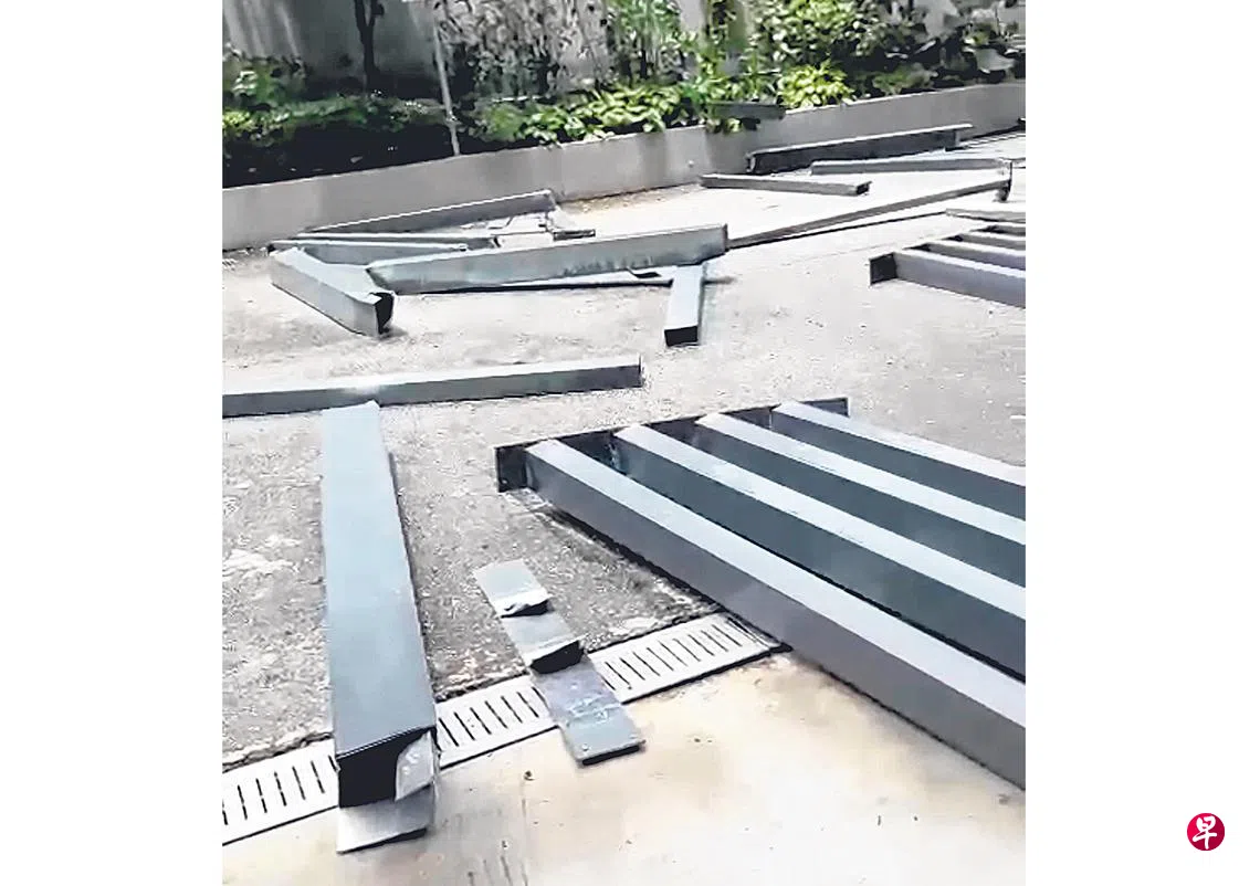 27米长装饰构件从八层高大厦坠落,“铁条”散满地,一楼职员闻声跳后躲避,惊险保住一命。