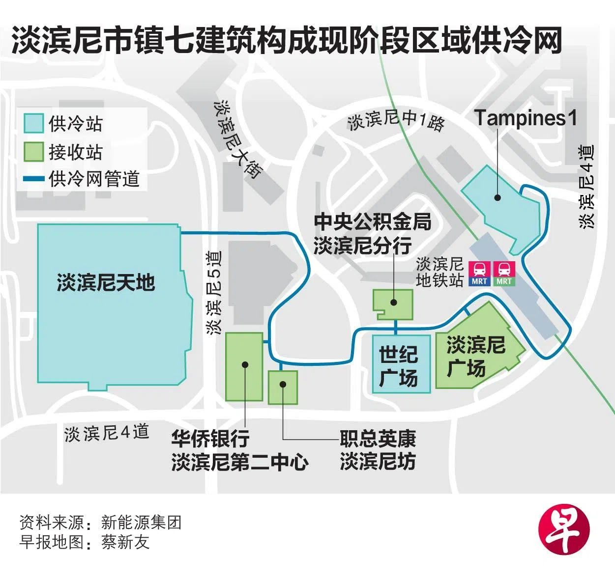 淡滨尼市镇中心的七座现有建筑已与供冷网络连接,包括世纪广场、中央公积金局淡滨尼分行、职总英康淡滨尼坊、华侨银行淡滨尼第二中心、淡滨尼天地、淡滨尼广场以及Tampines 1购物商场。