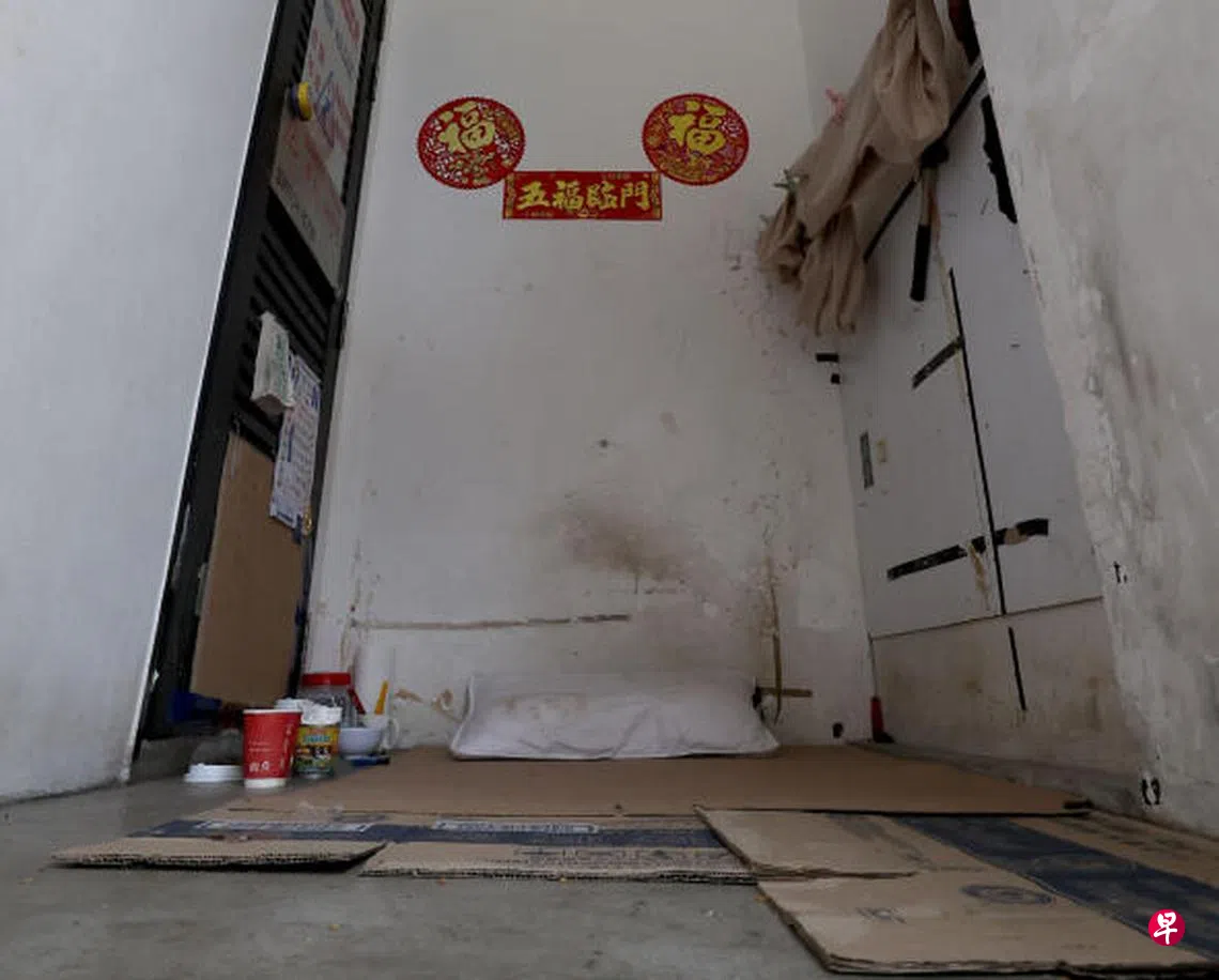 六旬阿叔被指在组屋停车场电房旁自设“小房间”,打造纸皮床、自备枕头、窗帘以及日历,引起居民关注。