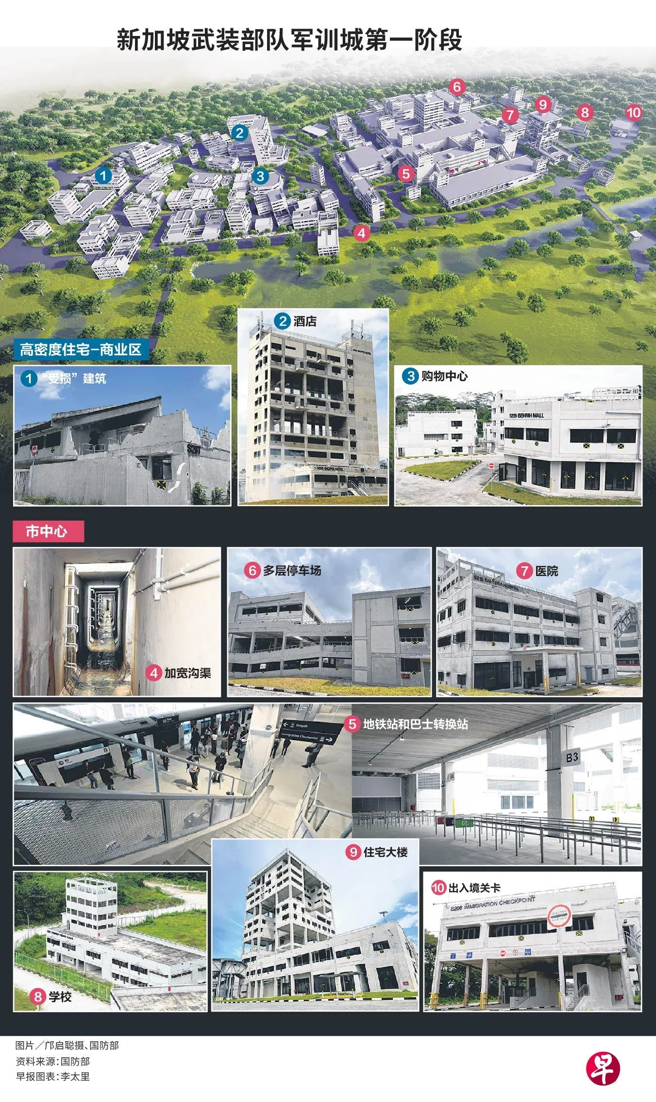 莱佛士坊地铁站入口、中央商业区的办公楼、结合地铁站和巴士转换站的综合交通枢纽、大巴窑建屋局中心、安详山的两层店屋……这些逼真如实际环境的模拟场景,都集中在西部的新加坡武装部队军训城。