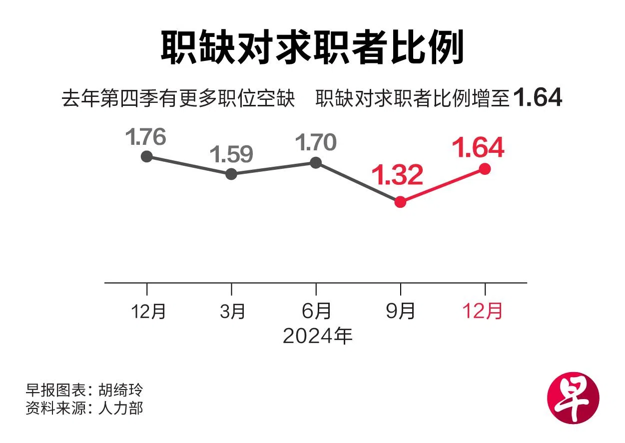 职缺对求职者的比例因此从去年9月的1.32,增至12月的1.64,但低于2023年12月的1.76。