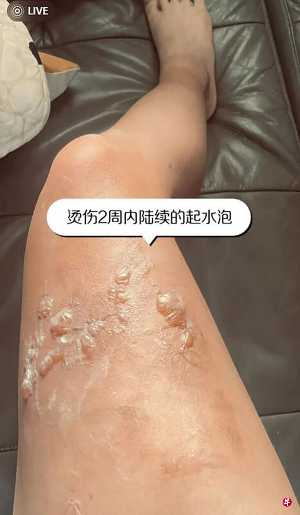 到医院治疗后,女事主回到家中还继续冲水。根据照片可见,她右大腿一大片泛红起水泡,另一大腿则有小部分起水泡。她也指出,大腿烫伤两周,还陆续在起水泡。