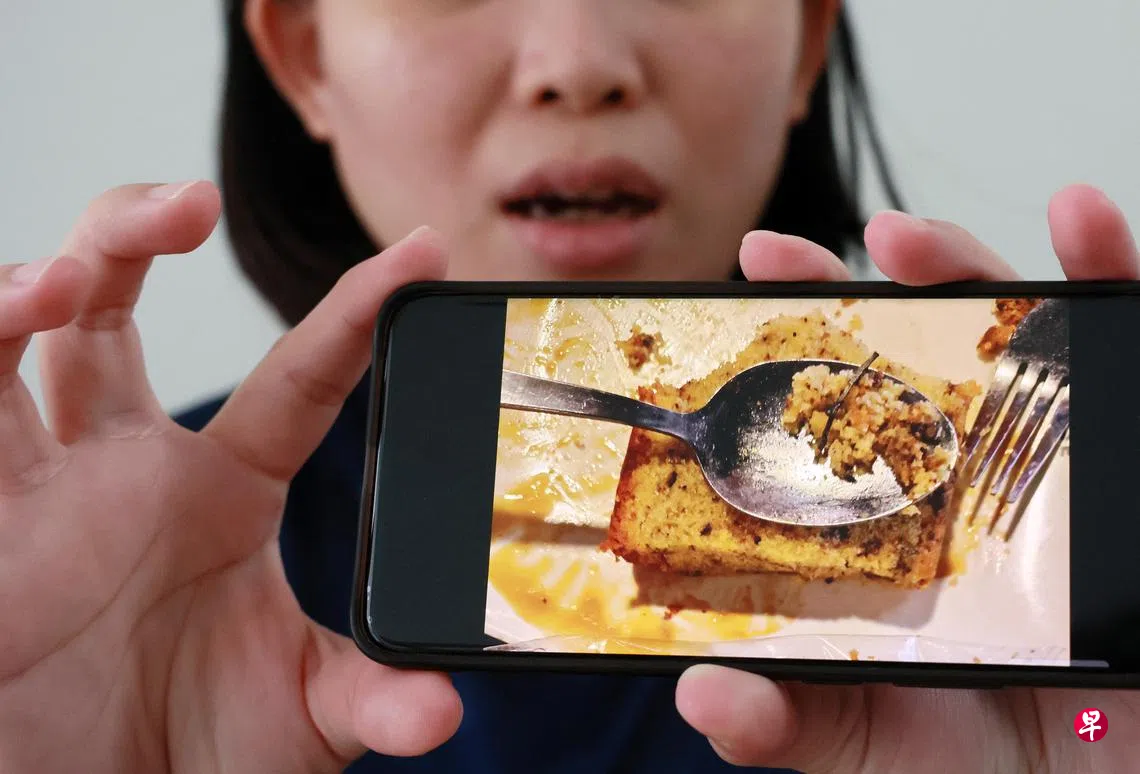 食客容女士(36岁)向《新明日报》申诉,丈夫当时在饮料摊买了包装好的核桃蛋糕给她吃,价格1元3角。