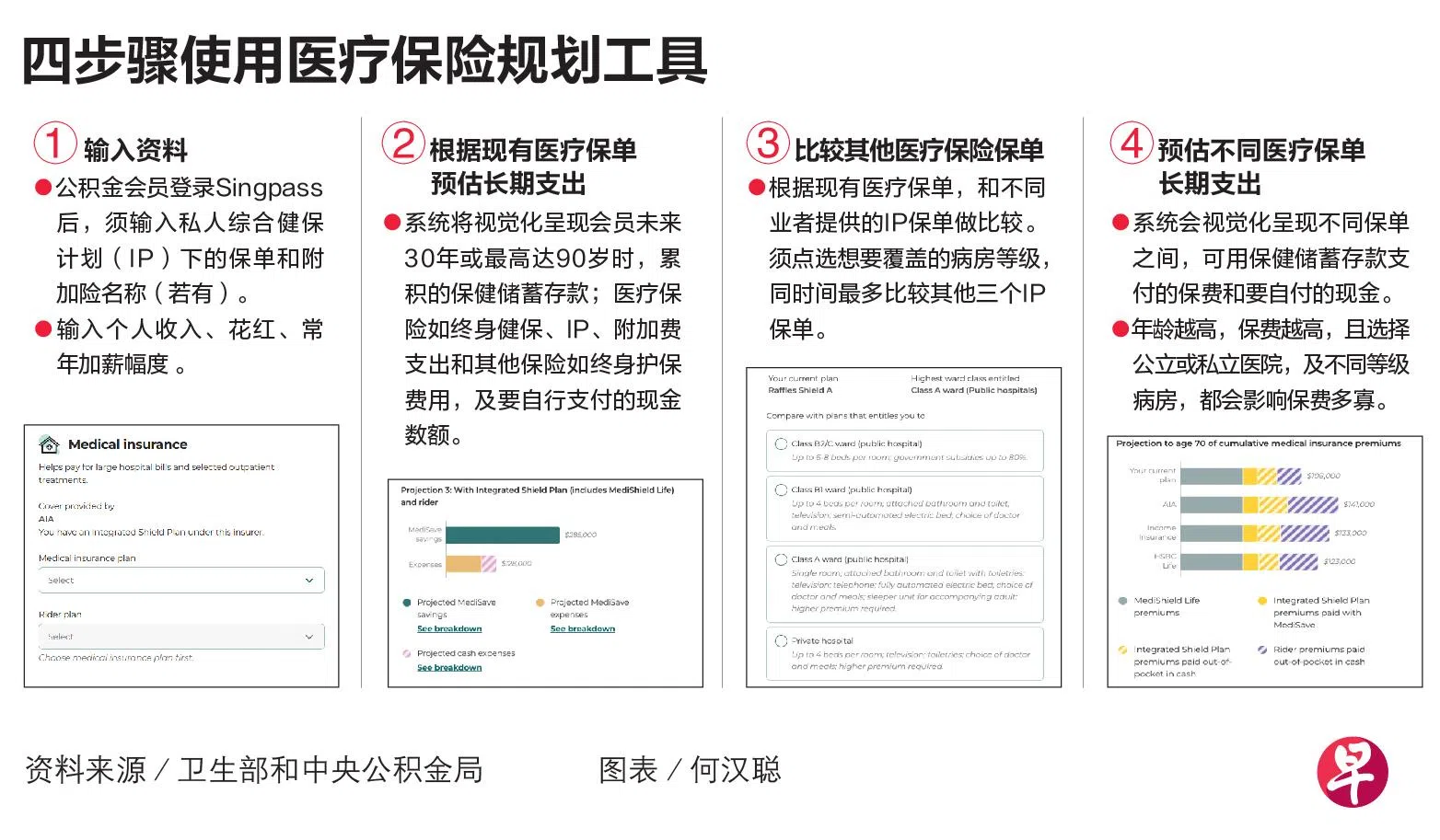 卫生部与中央公积金局星期三(3月26日)联手推出本地首个医疗保险规划工具(Health Insurance Planner,简称HIP),可助国人估算长期医疗保险所需费用,在投保时做出更明智的决定。