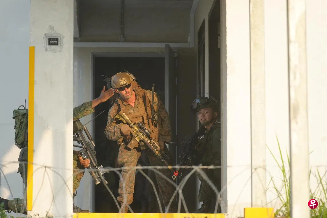 这是新加坡陆军部队和美国海军陆战队,为提高“英勇标志”(Valiant Mark)演习难度,星期三(3月26日)在最近开幕的新加坡武装部队军训城(SAFTI City)进行的一场联合攻坚训练。