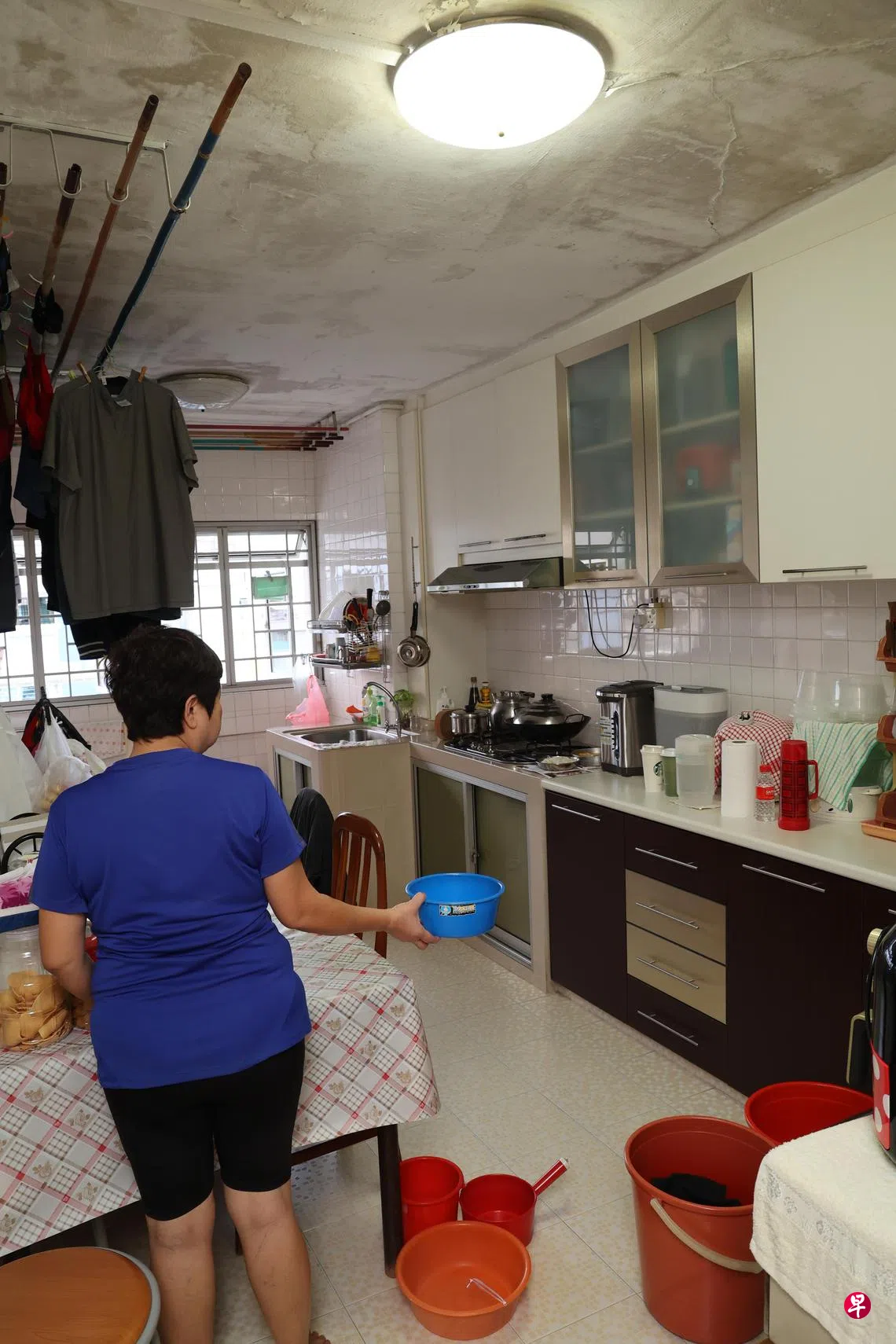 “每逢下雨天,厨房天花板就会漏水,我还得摆阵,放出水桶、水盆盛水。”