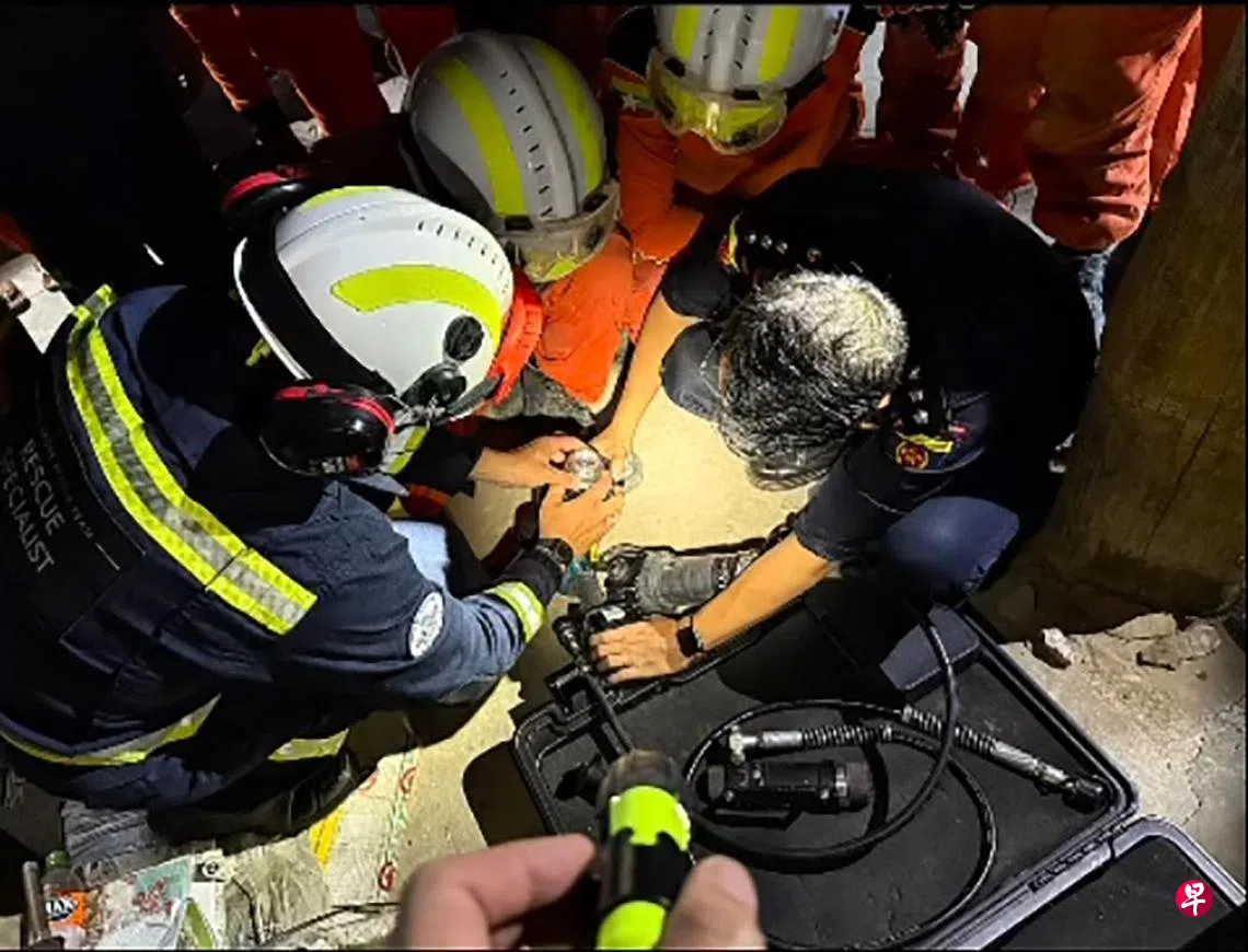 郑植维说,当天队伍接到当地消防部门的通知后,立刻前往现场展开行动,八小时后终于将人救出。“当时那名男伤者受困在两栋楼之间,位置非常危险,但在各方努力下,我们成功将他救出。当时他用缅甸语说了一些话,据了解他是向大家表达感谢。这次的成功救援鼓舞了大家的士气,让我们有信心会找到其他人。”