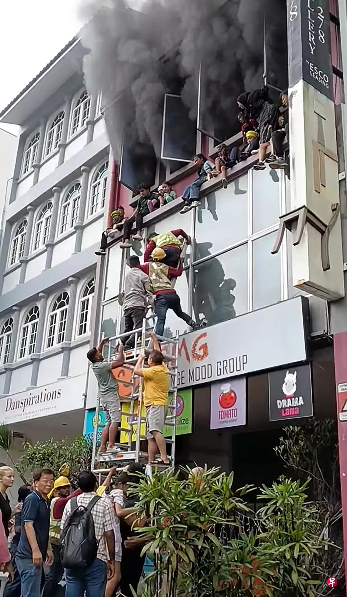 现场多名目击者告诉记者,多名教职员和孩童为了躲避浓烟爬出窗口,危坐窗沿上。正在附近工地工作的一群客工见状,第一时间搬来鹰架,架起平台,并在民防部队抵达前合力救下约10名孩童。