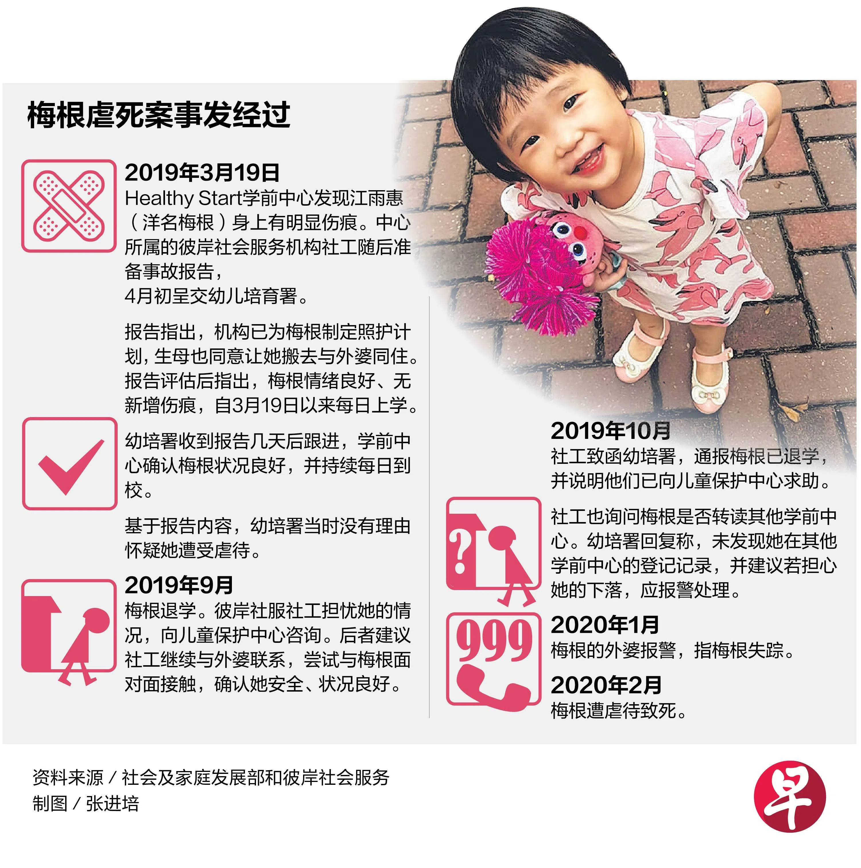 针对四岁女童江雨惠(洋名梅根)遭虐死和焚尸一案,社会及家庭发展部指出,她所就读的学前教育中心在梅根去世前约一年发现她的伤势,中心所属的社会服务机构社工曾向幼儿培育署提交报告。不过,报告未如庭上文件所示,充分反映伤势严重性,导致当局未能及时介入。