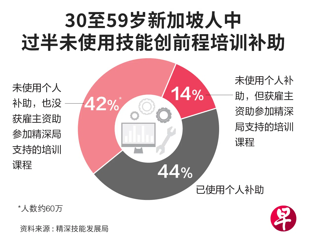 他举例,年龄介于30岁至59岁的新加坡人中,有44%已使用培训补助,另有14%虽未用补助,但获雇主资助上培训课。接下来,精深局的工作重点是积极接触剩余42%的人,约为60万人。