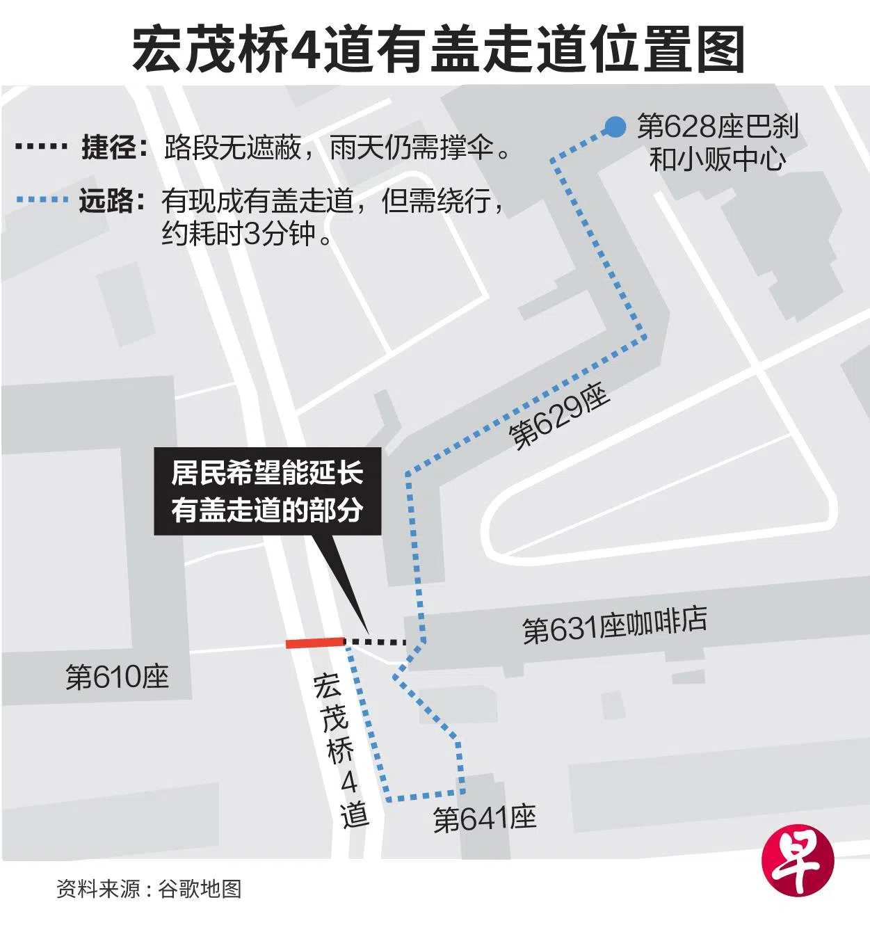 住在宏茂桥4道第610座组屋的谢卓帆(66岁,电子工程师)受访时说,他经常到第628座巴刹与小贩中心打包食物回家。遇到下雨时,就得在这段无遮盖的路段撑伞步行,先经过第631座咖啡店,再前往小贩中心。