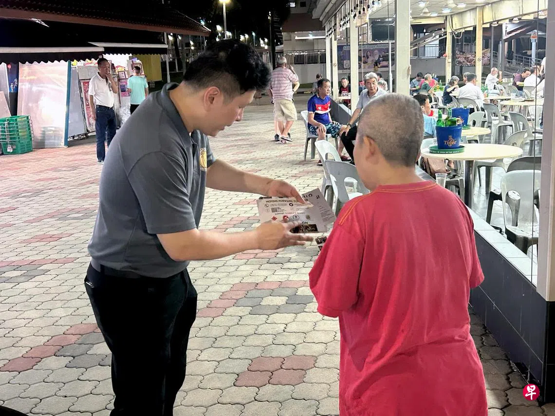 朱来成一行星期四在小贩中心向正在用餐的食客分发传单,传单的一面用四种语言标注“统一党”,而另一面则印有英语参选口号“Moving Forward, Together”(共同前进)。