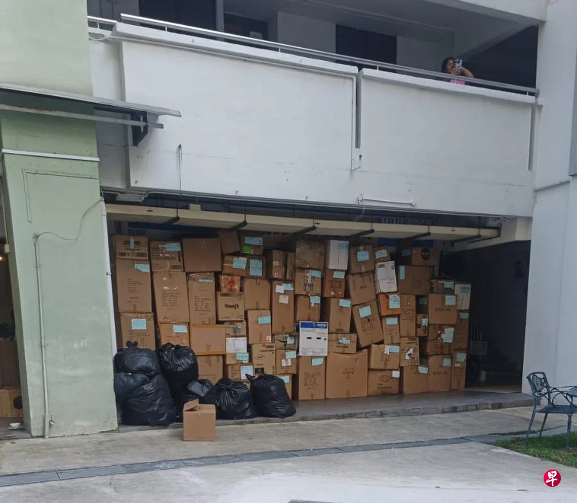 《新明日报》星期五(4月11日)接到组屋居民的投诉,指星期四(10日)下午,店门前堆积大量箱子,霸占了公共走廊空间,让人难以穿行。根据居民提供的照片显示,店门口摆放着五六十个大小不一的纸箱,从走廊地板堆积至天花板。
