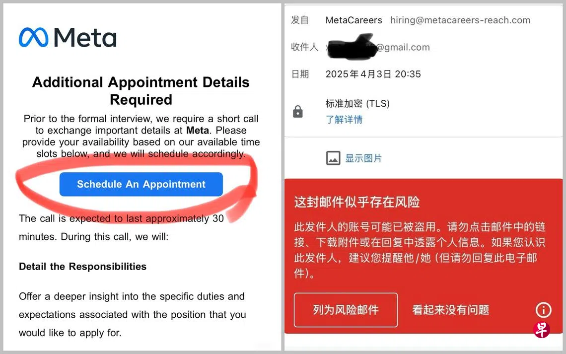 女子收到自称来自跨国网络公司Meta的招聘电邮,要求输入电邮地址和密码安排线上会谈,提供资料后才醒觉或堕入钓鱼骗局。