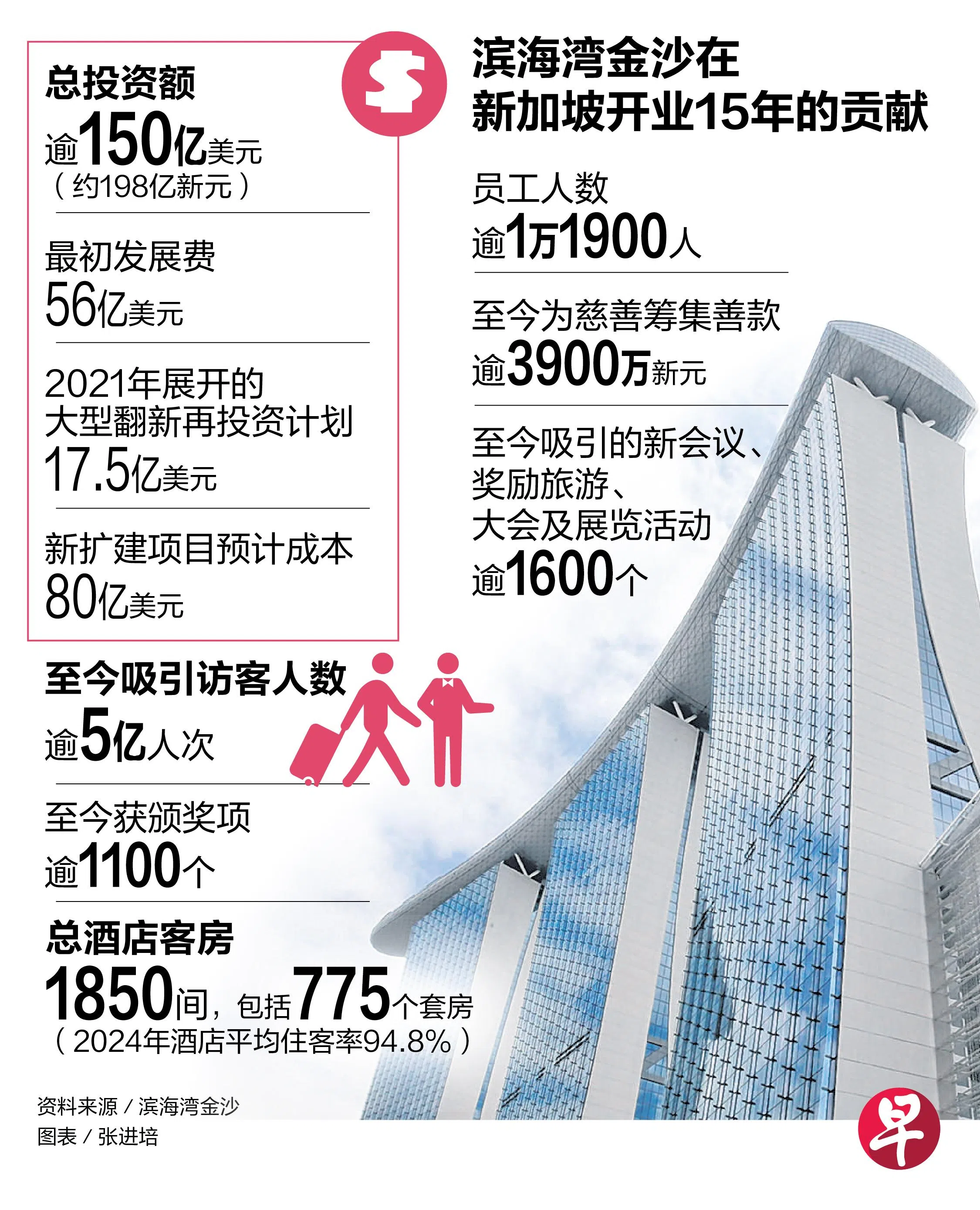 滨海湾金沙开业15年来,在我国投资了约150亿美元(约198亿新元)。随着酒店翻新工程即将完成,扩建项目今年中动土兴建,这座综合度假胜地正摩拳擦掌,强攻豪华尤其超奢华旅游市场,谱写新篇章。