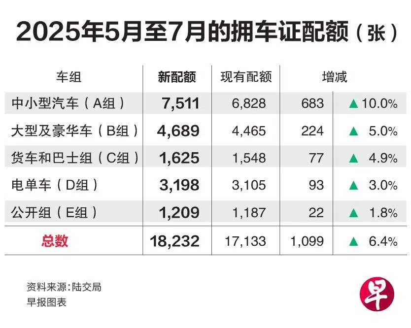 货车和巴士组(C组)配额共1625张,增加77张(4.9%);电单车组(D组)配额也增93张(3%),共3198张。