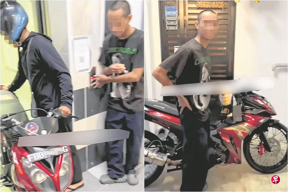 网上流传的视频显示,一名青年推着红色电单车进入组屋电梯,另一人帮忙按电梯按钮,第三人则在一旁拍摄。