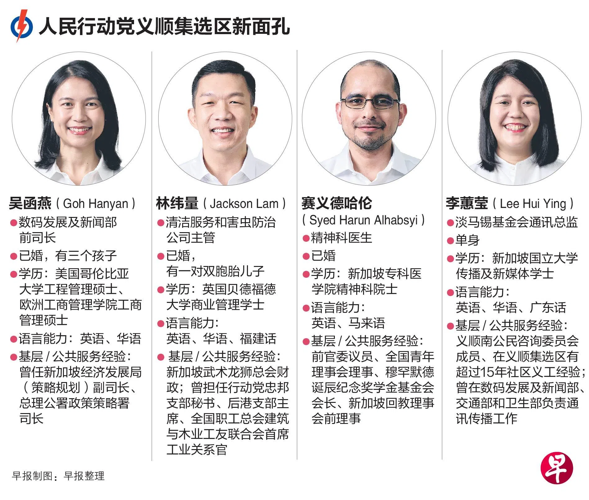 他们是:清洁服务和害虫防治公司主管林纬量(Jackson Lam,40岁)、淡马锡基金会通讯总监李蕙莹(Lee Hui Ying,35岁)、数码发展及新闻部前司长吴函燕(Goh Hanyan,39岁),以及曾任官委议员的精神科医生赛义德哈伦(Syed Harun Alhabsyi,40岁)。
