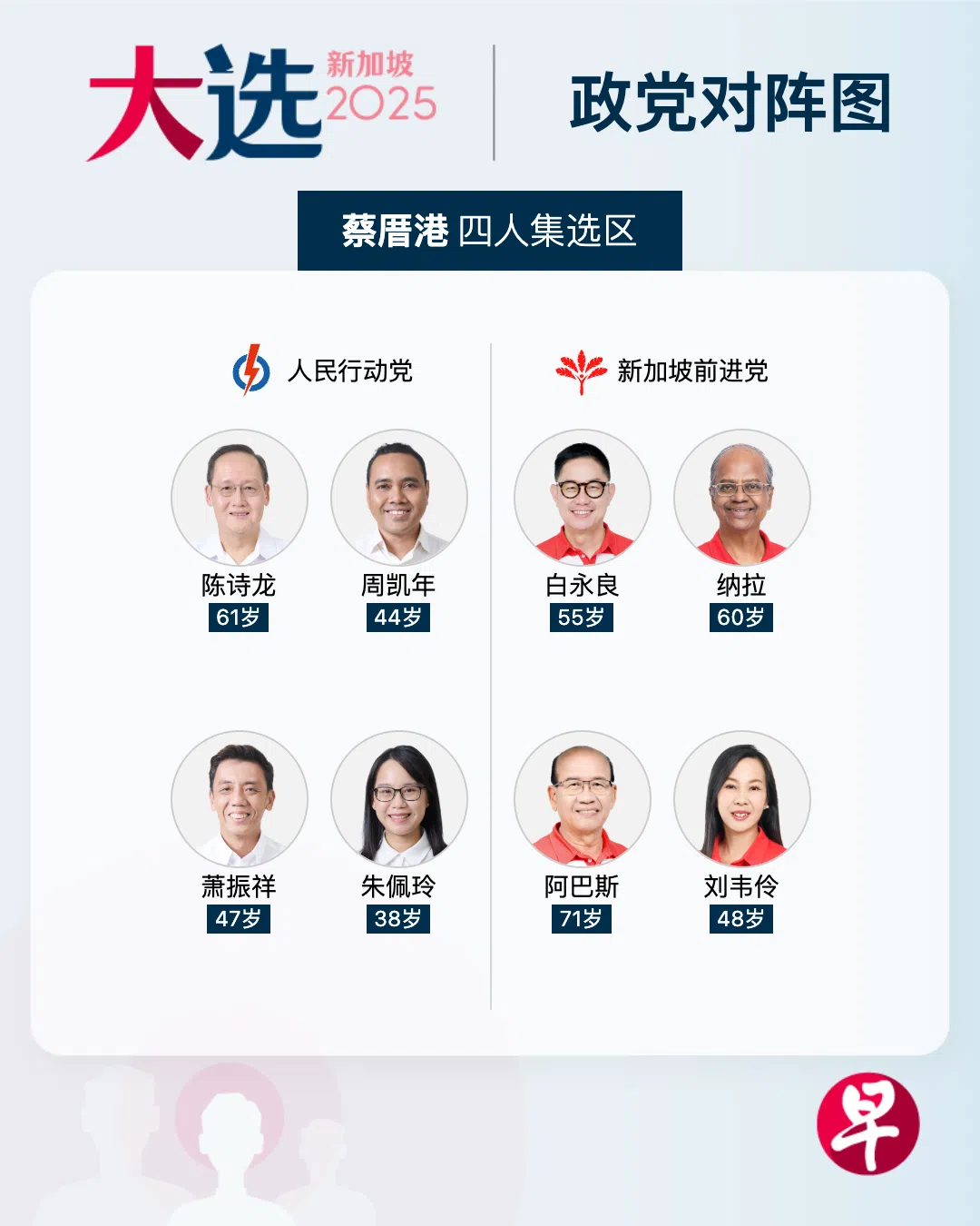 除了陈诗龙外,蔡厝港集选区行动党团队其他候选人不变,包括原议员周凯年与两名新人——人力部和贸工部前第二常任秘书萧振祥,以及新加坡理工大学卫生与社会科学学院助理教授朱佩玲。