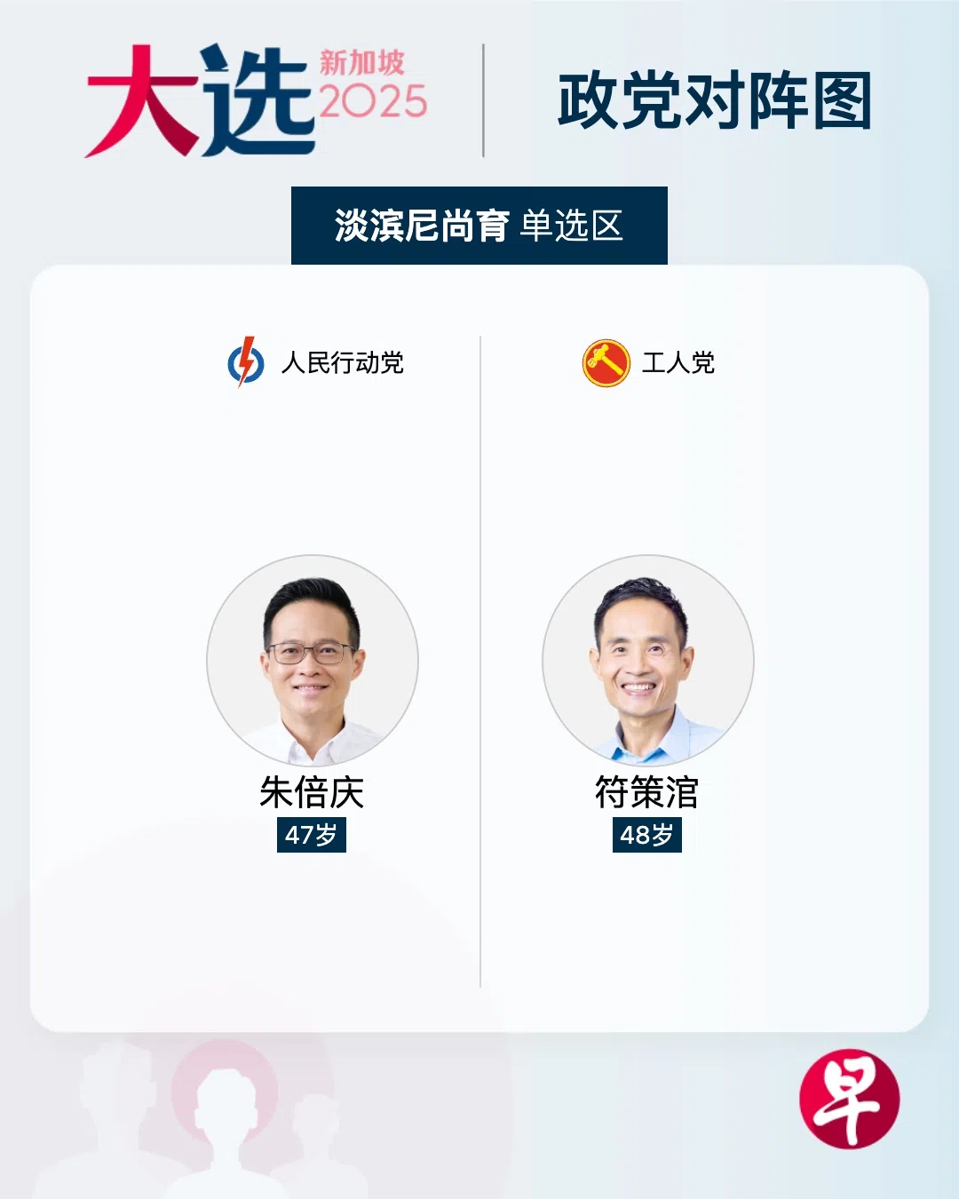 从淡滨尼集选区新划分出的单选区淡滨尼尚育,确定由人民行动党的朱倍庆对阵工人党的符策涫。朱倍庆指出,他已深耕基层10年,希望能继续推动社区进步;符策涫则希望通过“望闻问切”把脉社区需求,与选民共创未来。