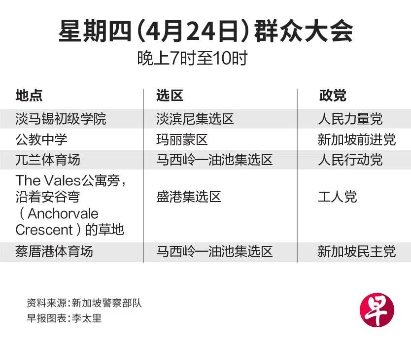 人民行动党、工人党等政党星期四(4月24日)晚上,将分别举行五场群众大会。