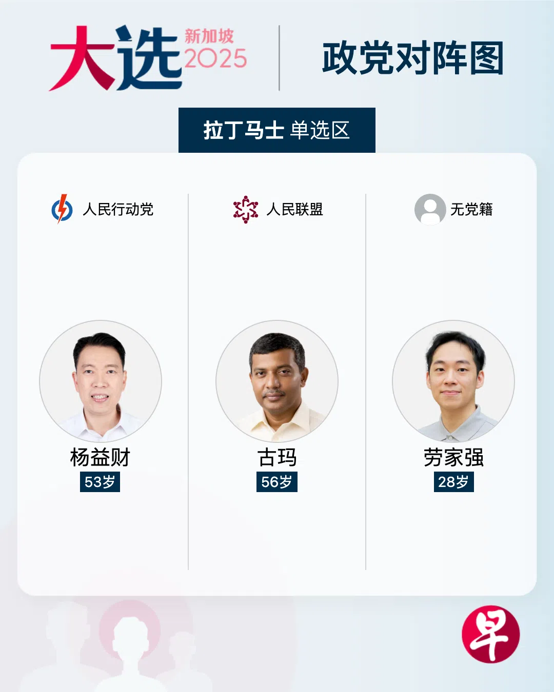 选举官星期三(4月23日)在明智小学提名站宣布竞逐拉丁马士单选区的三名候选人,分别是人民行动党的杨益财(53岁)、人民联盟的古玛(Kumar Appavoo,56岁),以及无党籍人士劳家强(28岁)。