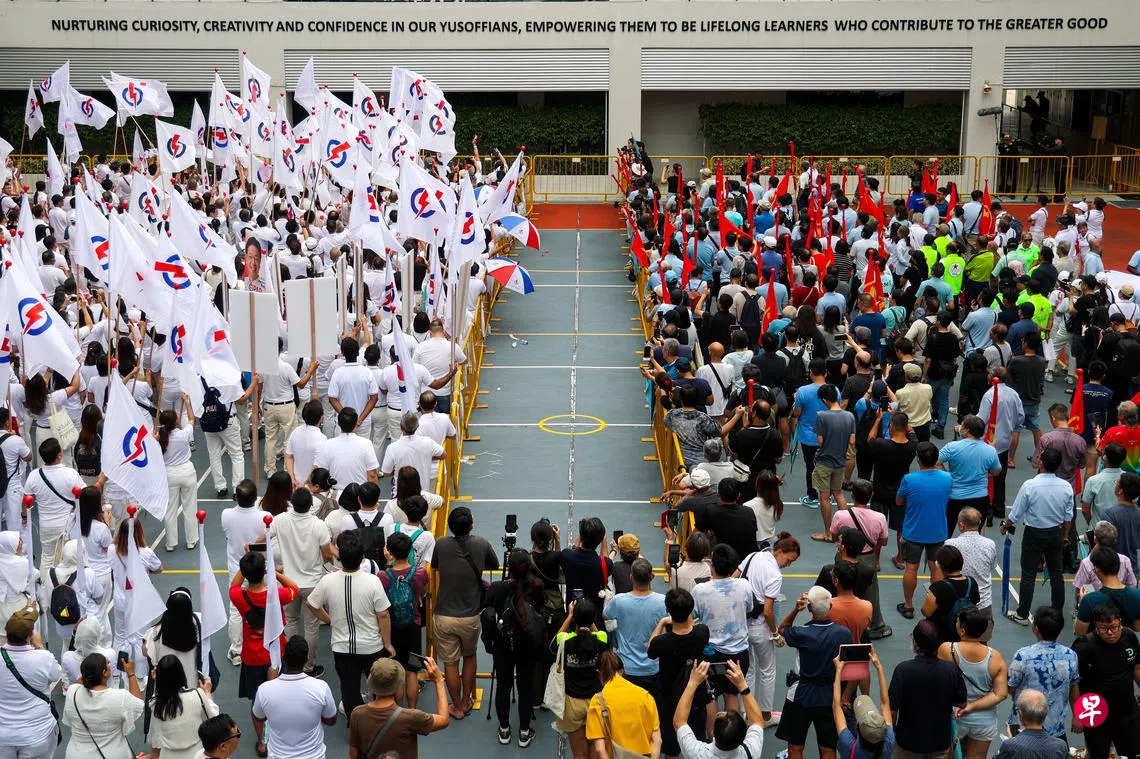 呈交提名表格后,代表人民行动党和工人党出征榜鹅集选区的两个团队,分别在学校三楼处向一楼广场的蓝白支持者挥手示意,场上欢呼声一波接着一波。